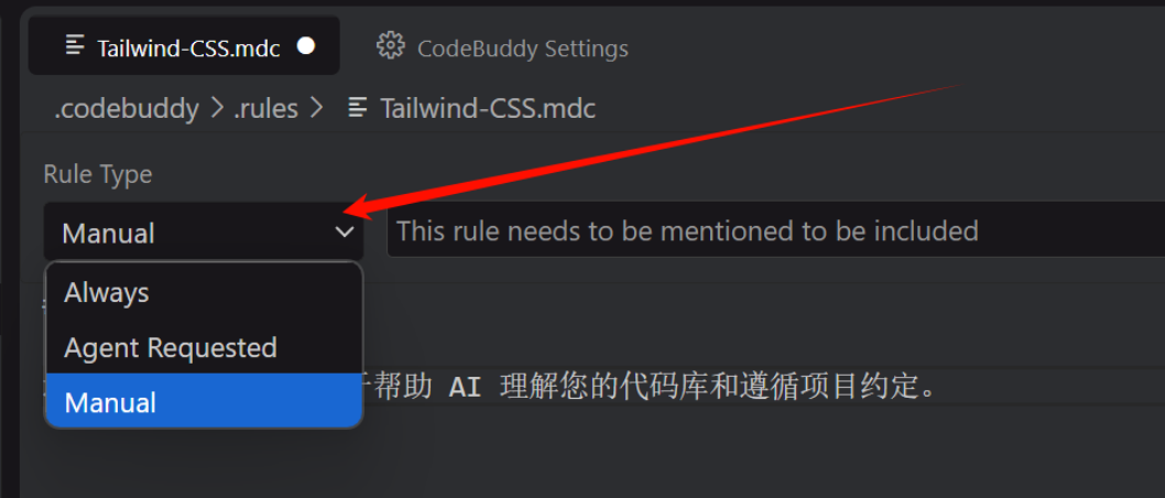 定义项目级别的 Rules,例如编码规范、框架约定、库使用规则、安全要求,这些 Rules 将在当前项目中生效,并且 Agent 会自动识别和获取到这些 Rules。在 CodeBuddy 中将 Project Rules 默认保存在 .codebuddy/.rules,可以识别 md 和 mdc 两种格式。