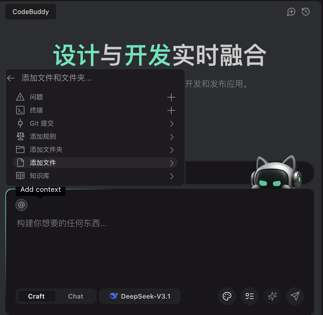 就像腾讯元宝一样,CodeBuddy IDE 提供了侧栏对话功能,支持 Craft / Chat 两种模式,可以在不跳出 IDE 的情况下,在对话中描述你的需求,与 AI 互动,可实时获取 AI 建议及任何帮助,通过输入 “@” 等引入代码片段、知识库等上下文,拓展更多指令应用场景。