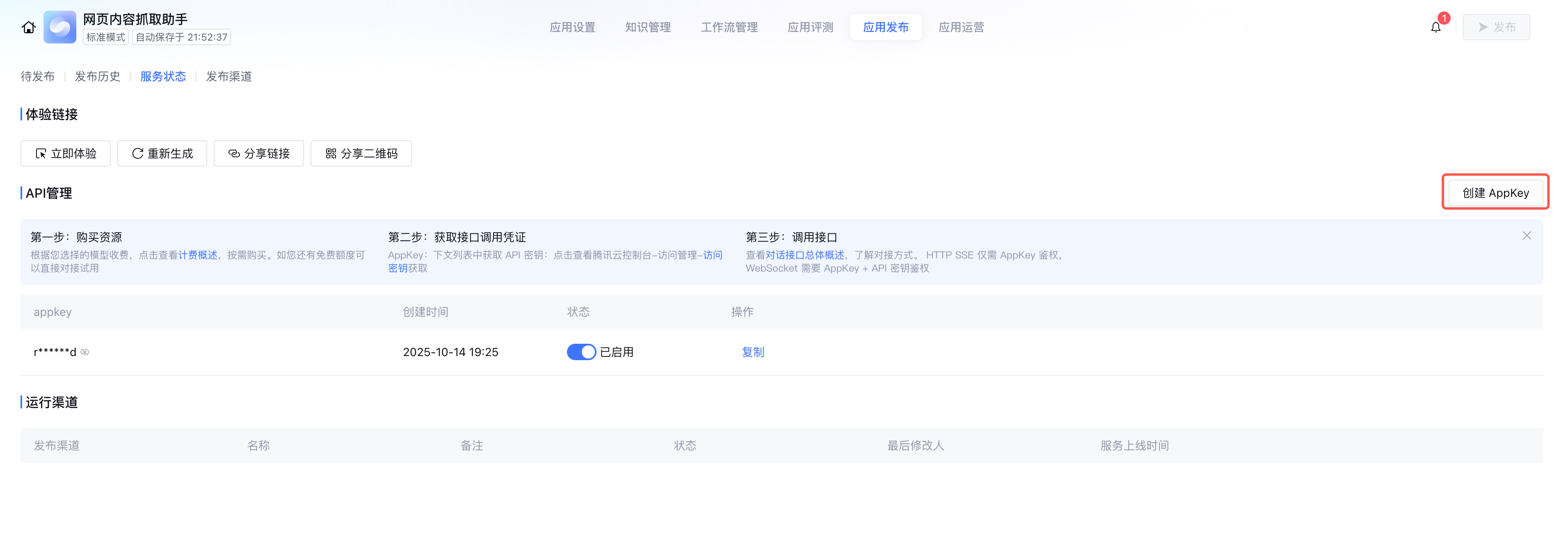 成功发布之后,您可在服务状态页签内获取体验链接进行直接体验或获取 appkey 进行 API 管理。