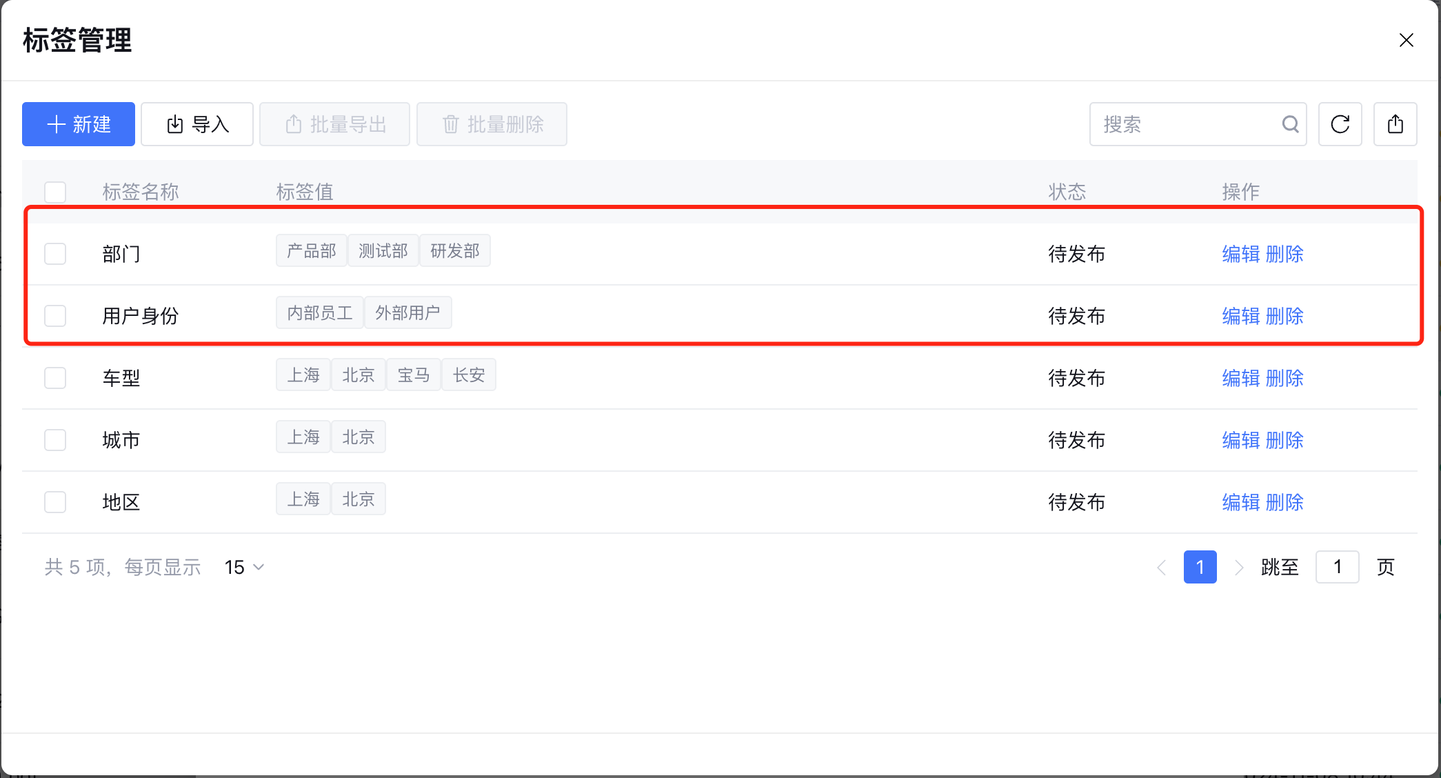 用户身份的标签值包括内部员工和外部用户,部门的标签值包括产品部、研发部、测试部。