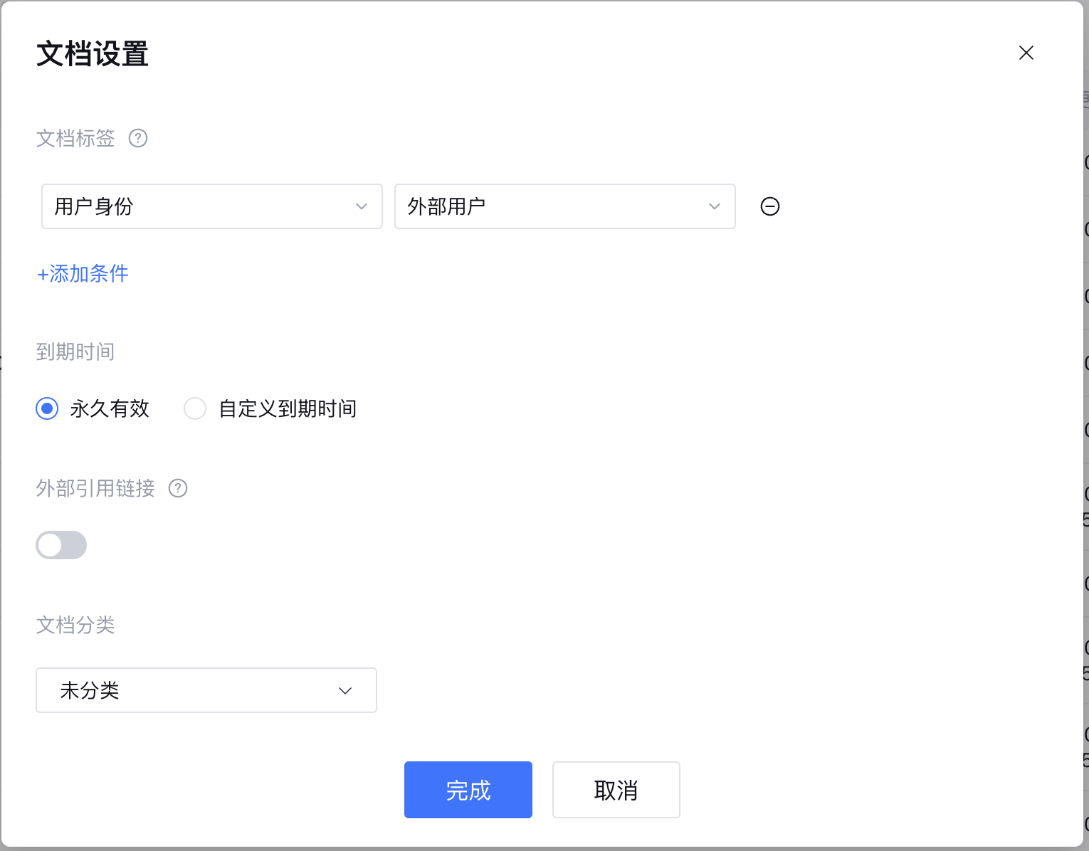 1. 外部用户可见的文档,在文档标签中选择“标签名称=用户身份”;“标签值=外部用户”,不用设置部门标签。单个文档/问答中最多可打10个标签。