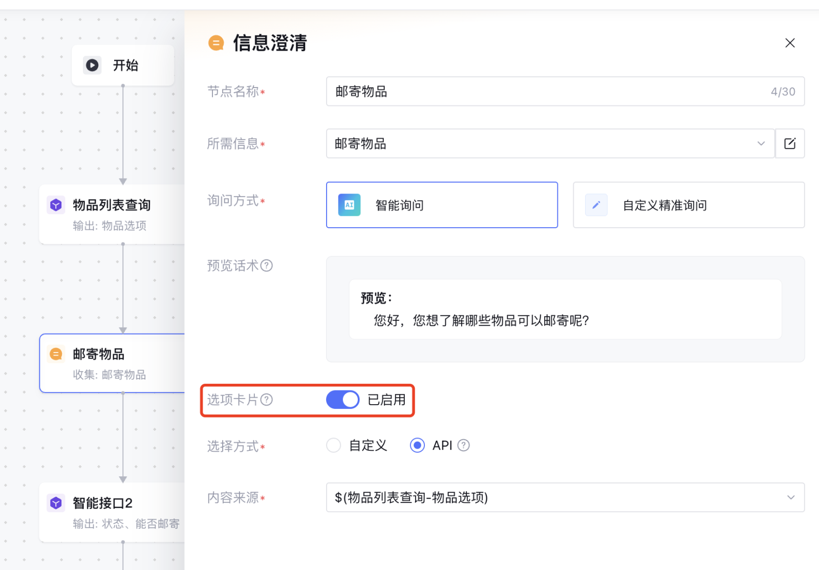 如果期望展示选项列表供用户选择,则可以选择开启选项卡片;自定义输入选项,每个选项回车后完成输入,或者引用前序 API 的出参作为候选项(需要为array 格式)。信息澄清节点支持收集非必填参数/实体,非必填时,智能询问将不会主动追问。