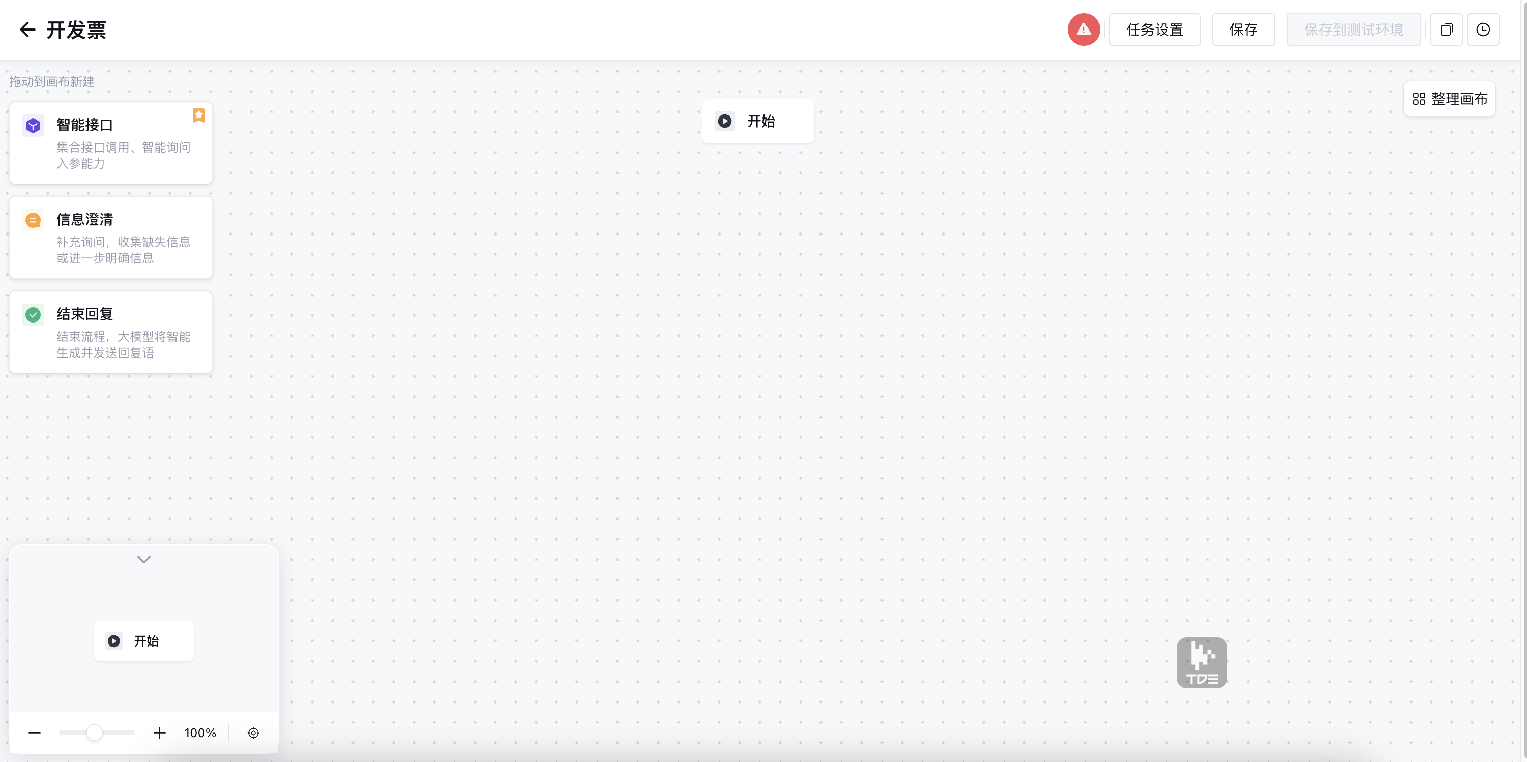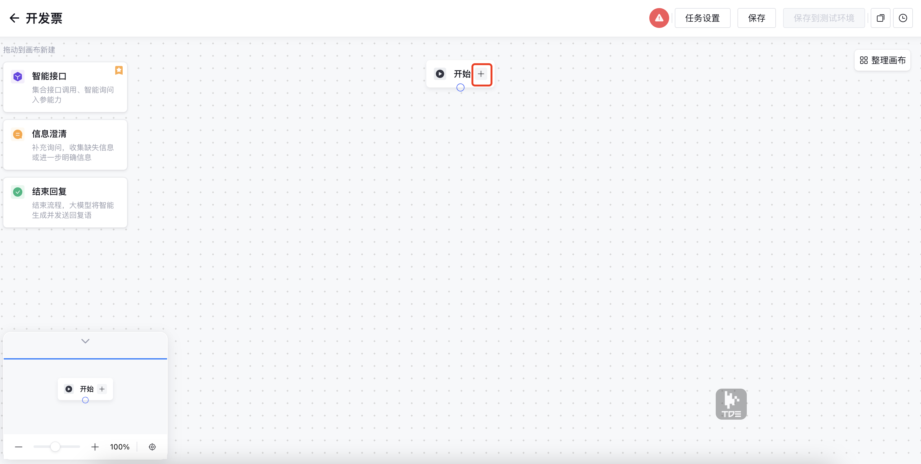 4. 新建完毕后即进入画布的编辑界面。默认有一个开始节点,表达一个指定画布的开端。