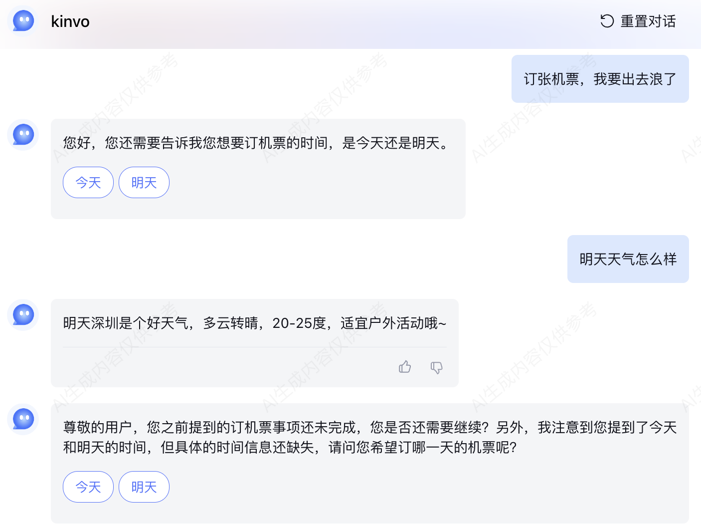 6. 话题拉回:大模型可以随时识别到用户新的疑问,解答后可以主动提示用户未完成的任务是否继续。