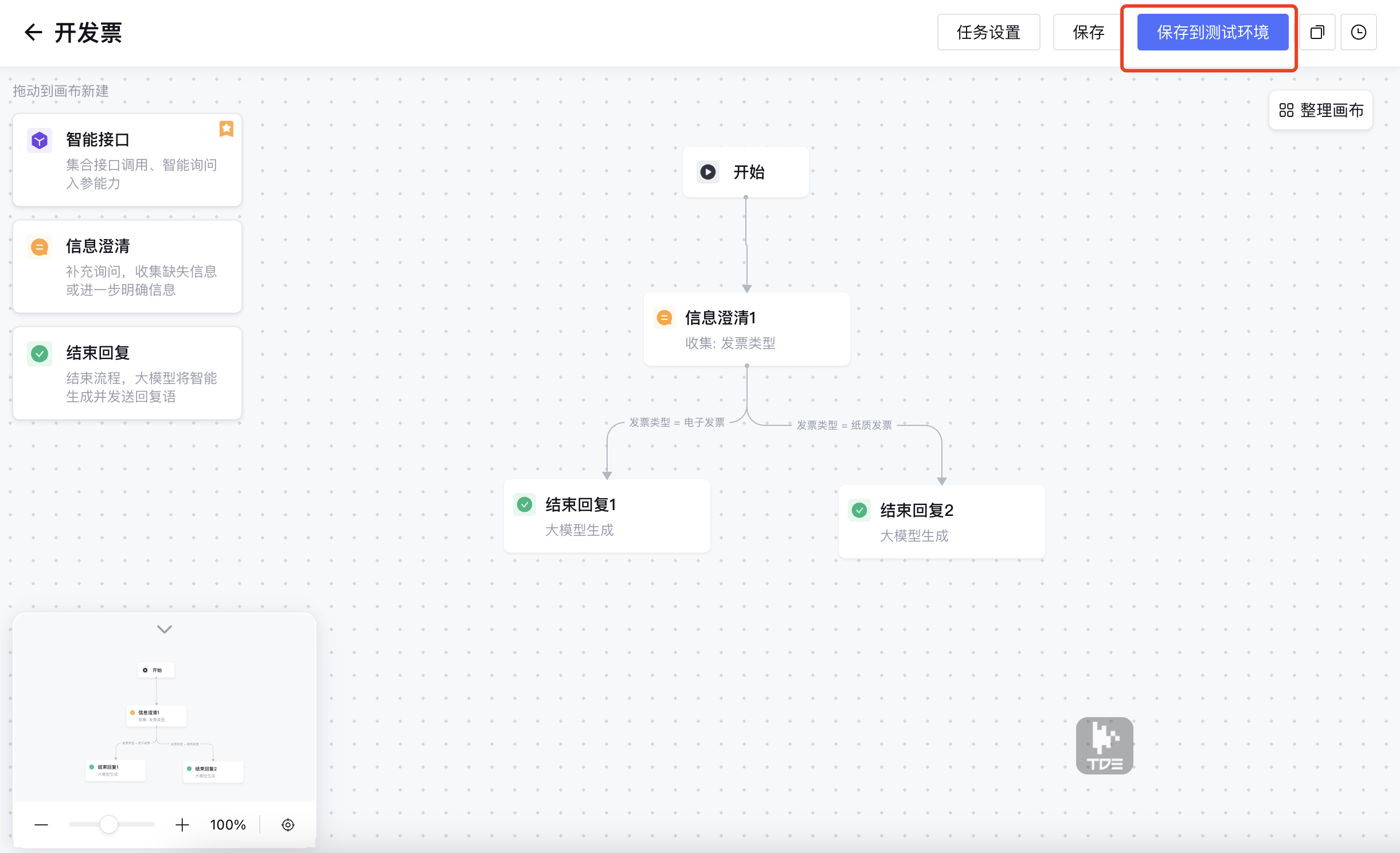 6. 画布设计完成后,需要点击发布到测试环境才能在应用配置页面中体验。
