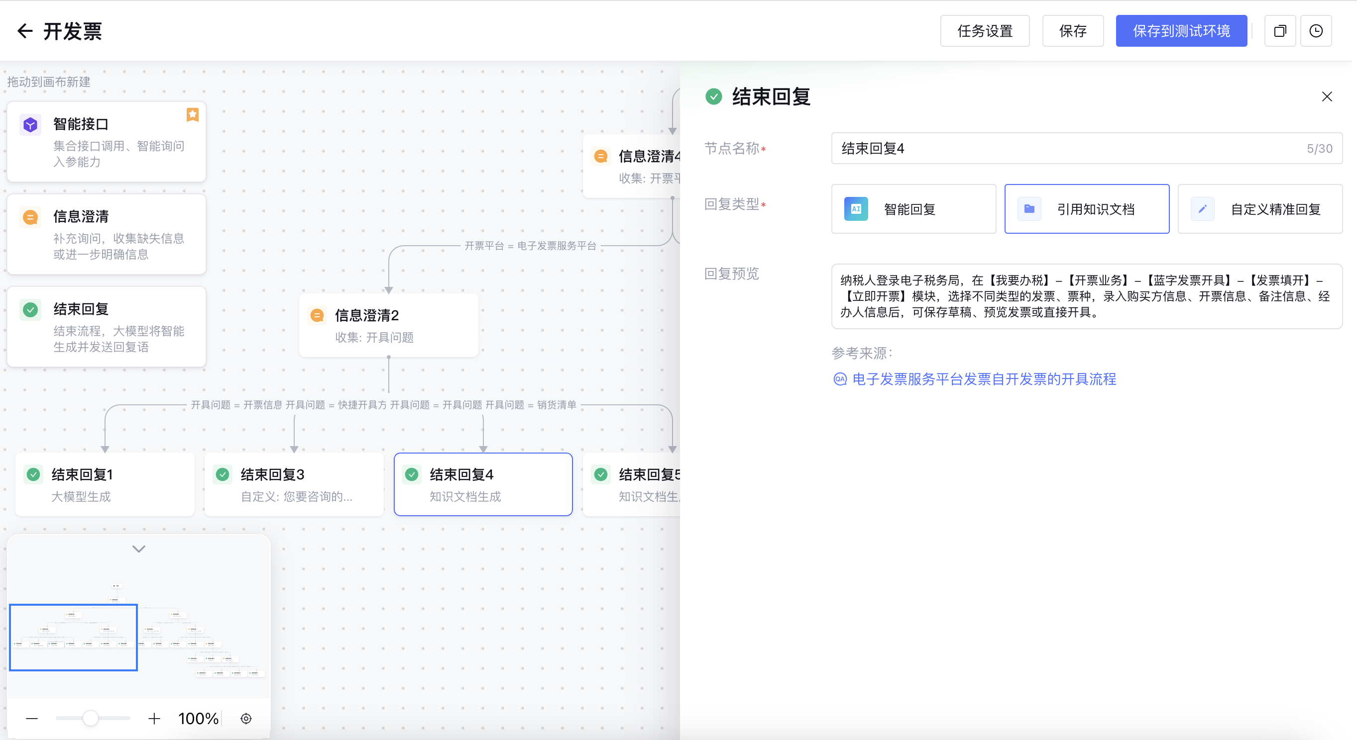 经过多轮澄清后,最终任务完成时的应答配置。可选择智能回复,让大模型根据上文对话自动生成答复,同时可以自定义提示词控制智能回复输出答案结果;可以选择引用文档知识,根据上文对话搜集到的细节信息,基于文档和问答知识作答;也可以选择自定义业务回复。