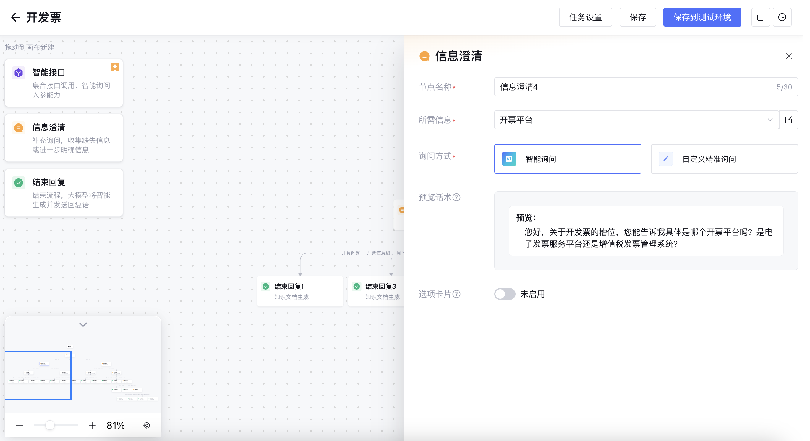 任务流程适用于需要多轮复杂对话获取不同的业务关键信息、或者需要查询业务系统才能完成对用户提问的解答。知识引擎提供可视化画布表达业务问题的解决思路。