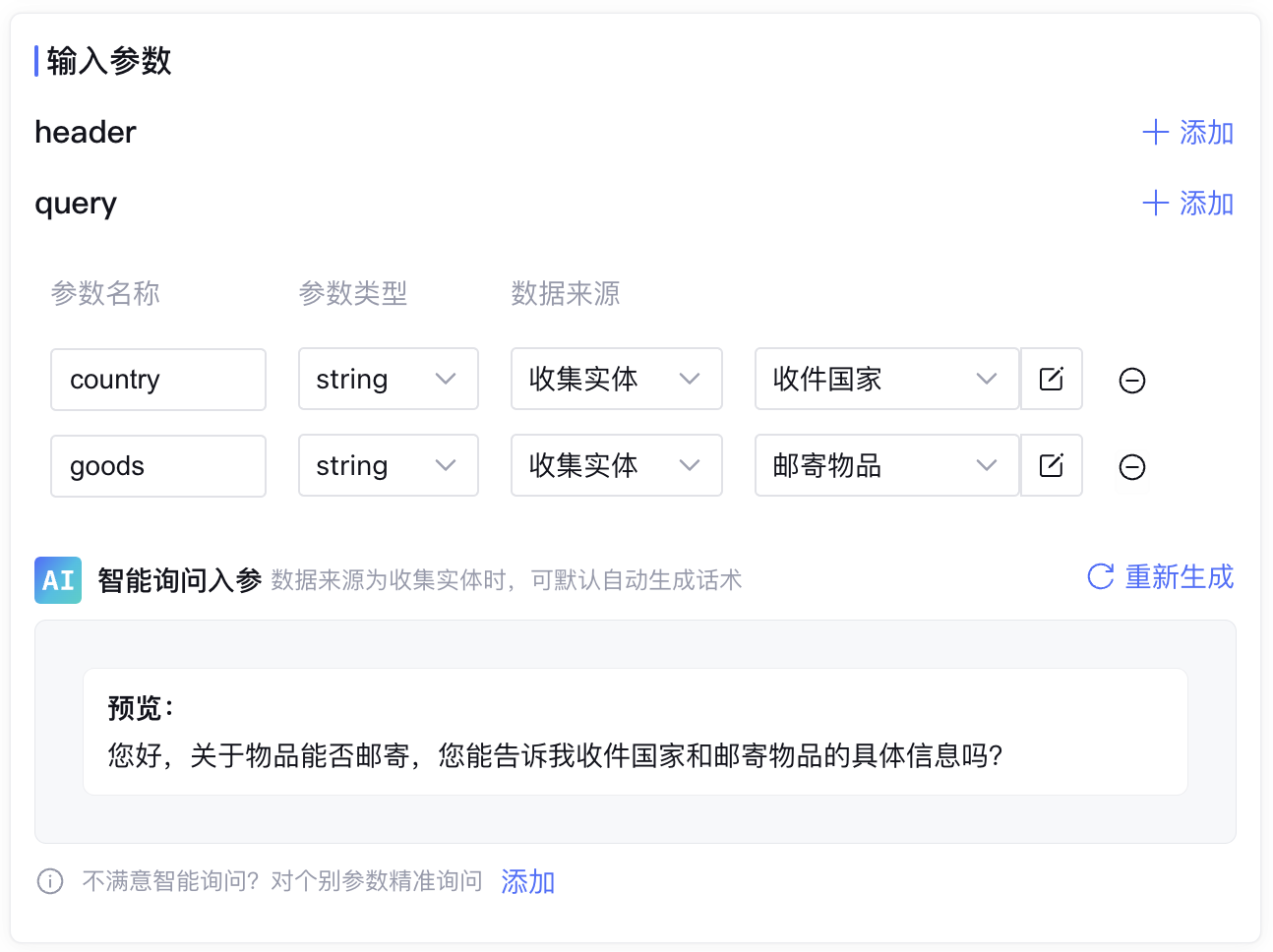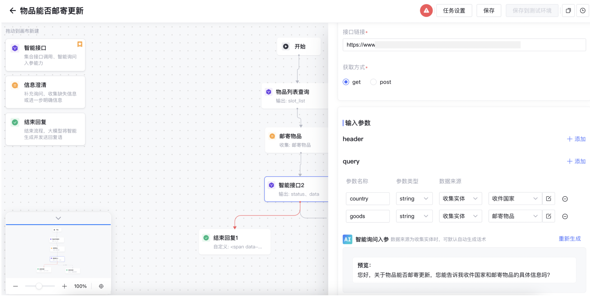 当需要和业务接口互动完成接口调用时,可使用智能接口节点。在节点中配置 http 或者 https 的接口链接,并且定义出参及其对应含义、入参及其对应含义,大模型可以在实际对话中,根据入参信息的完善情况灵活发起澄清追问。所有信息通过对话获取成功后即发起接口调用。