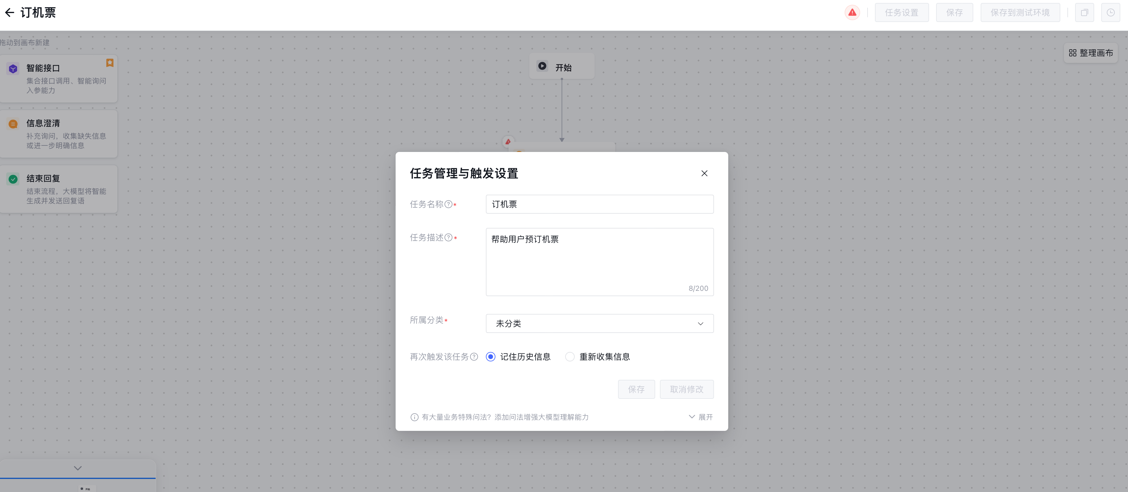 2. 新建任务流程,需要定义任务流程的名称、描述等关键信息,用于帮助大模型了解这个任务是什么,在对话时大模型才能准确判断何时应该规划哪个任务流程的执行;点击画布右上角的“任务设置”也可以唤起任务流程基本信息的编辑修改。
