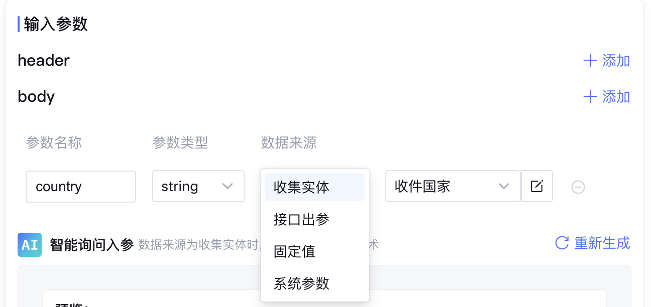 输入参数的数据来源有四种选项:收集实体、接口出参、固定值、系统参数。