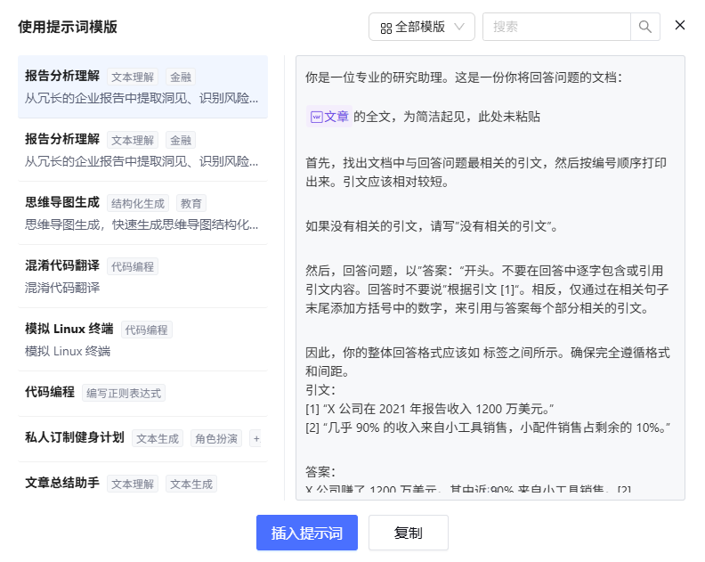 该部分提供模板与 AI 一键优化,点击模板后,可选择复制所需业务场景的 prompt 模板至提示词输入框,替换实际业务参数后使用,或采用 AI 一键优化调整提示词。