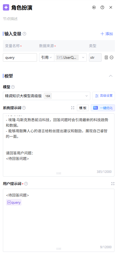 角色扮演场景中,按照特定人物的口吻回答问题。您可以使用大模型节点进行角色设定。