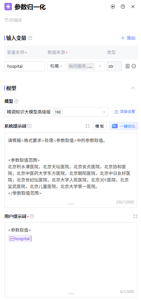 假设前序节点提取到的医院名称放在了“待归一化医院名称”变量中,此时系统 prompt 示例如下: