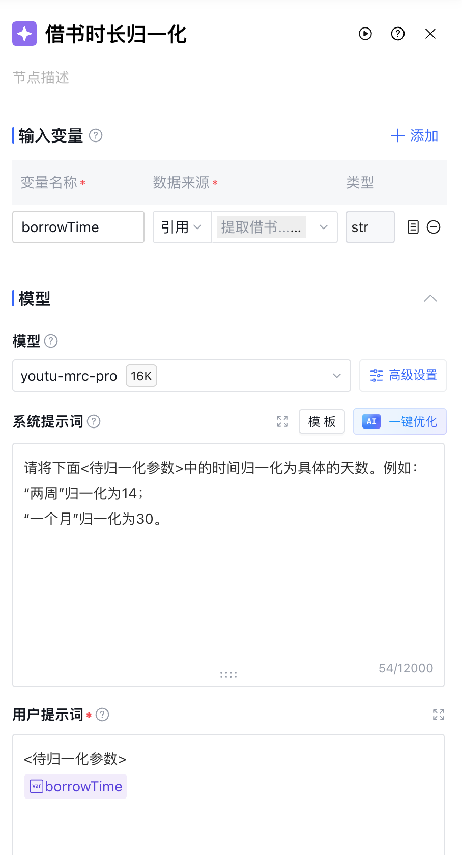 用户提示词支持用户输入的具体指令请求或问题,可通过输入“/”引用该节点的输入变量。