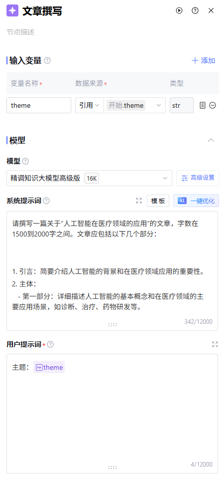 在文章写作场景中,您可以通过系统 prompt 定义写作要求,利用大模型直接生成文章。