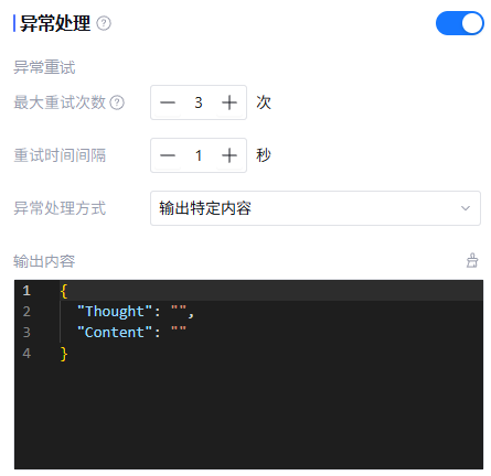 可手动开启异常处理,支持异常重试和异常情况的输出内容配置。配置内容如下: