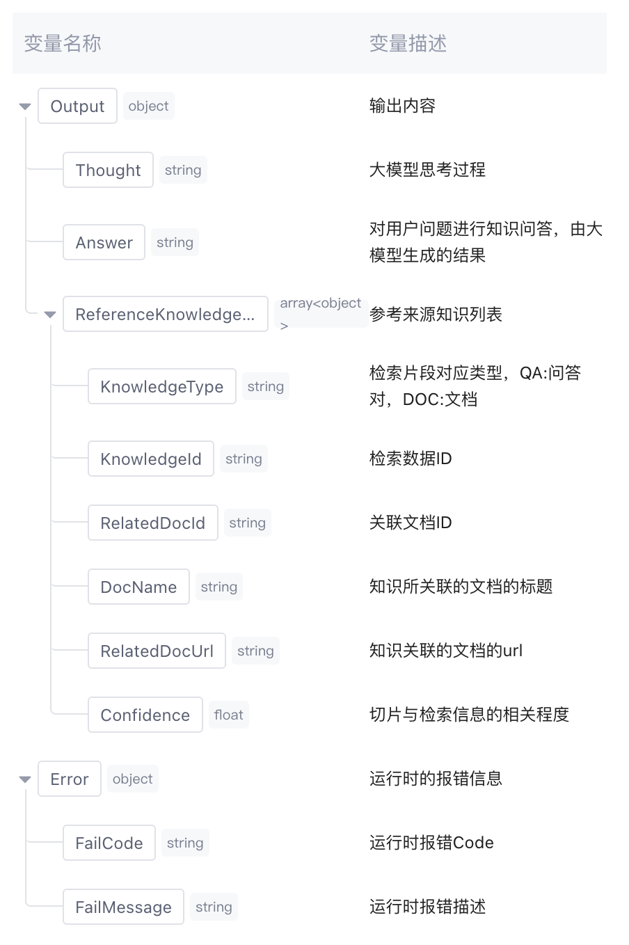 经该节点处理后的输出变量,默认为大模型思考过程、大模型运行后输出内容和检索到的知识片段列表,以及运行时报错信息 Error(数据类型为 object,正常运行时该字段为空)。不支持手动新增。