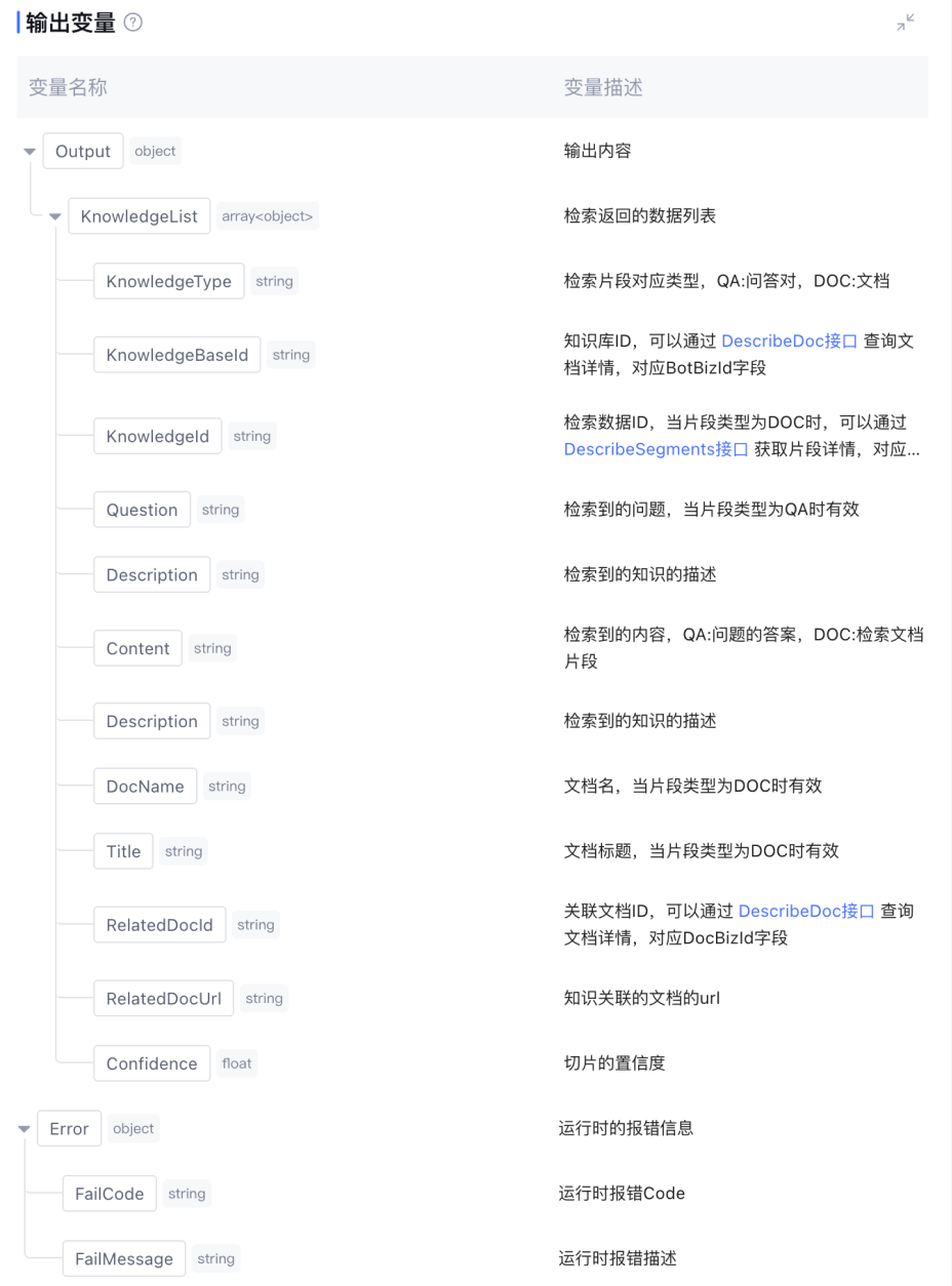 默认包含检索到的知识片段,以及运行时报错信息 Error(数据类型为 object,正常运行时该字段为空)。不支持手动新增。