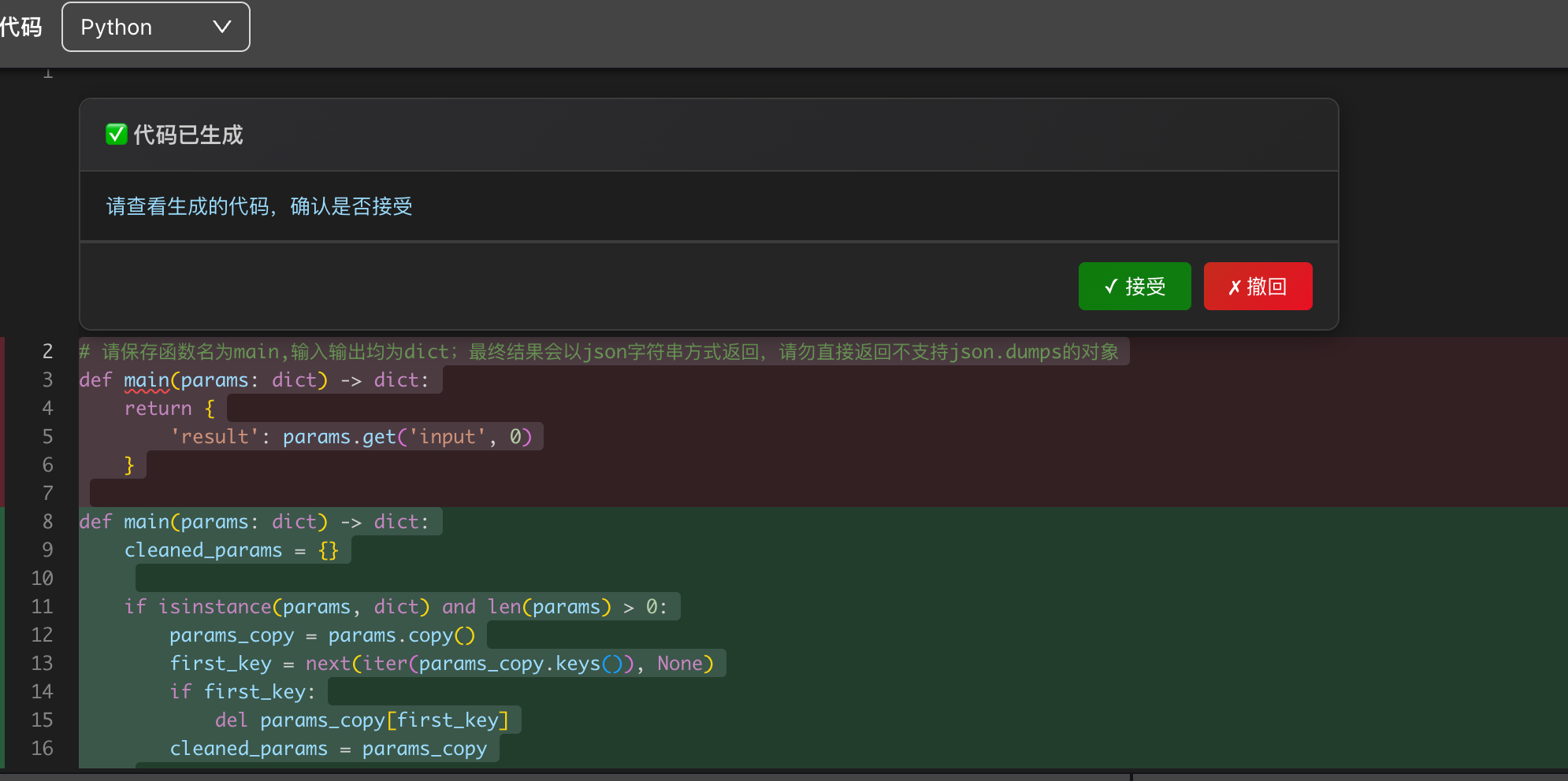 生成完成后,系统会显示由 AI 生成的代码建议。若对生成结果满意,可点击 “接受” 按钮,将当前代码替换为 AI 生成代码;若不满意,可点击 “撤回” 按钮,放弃本次修改并保留原始内容。