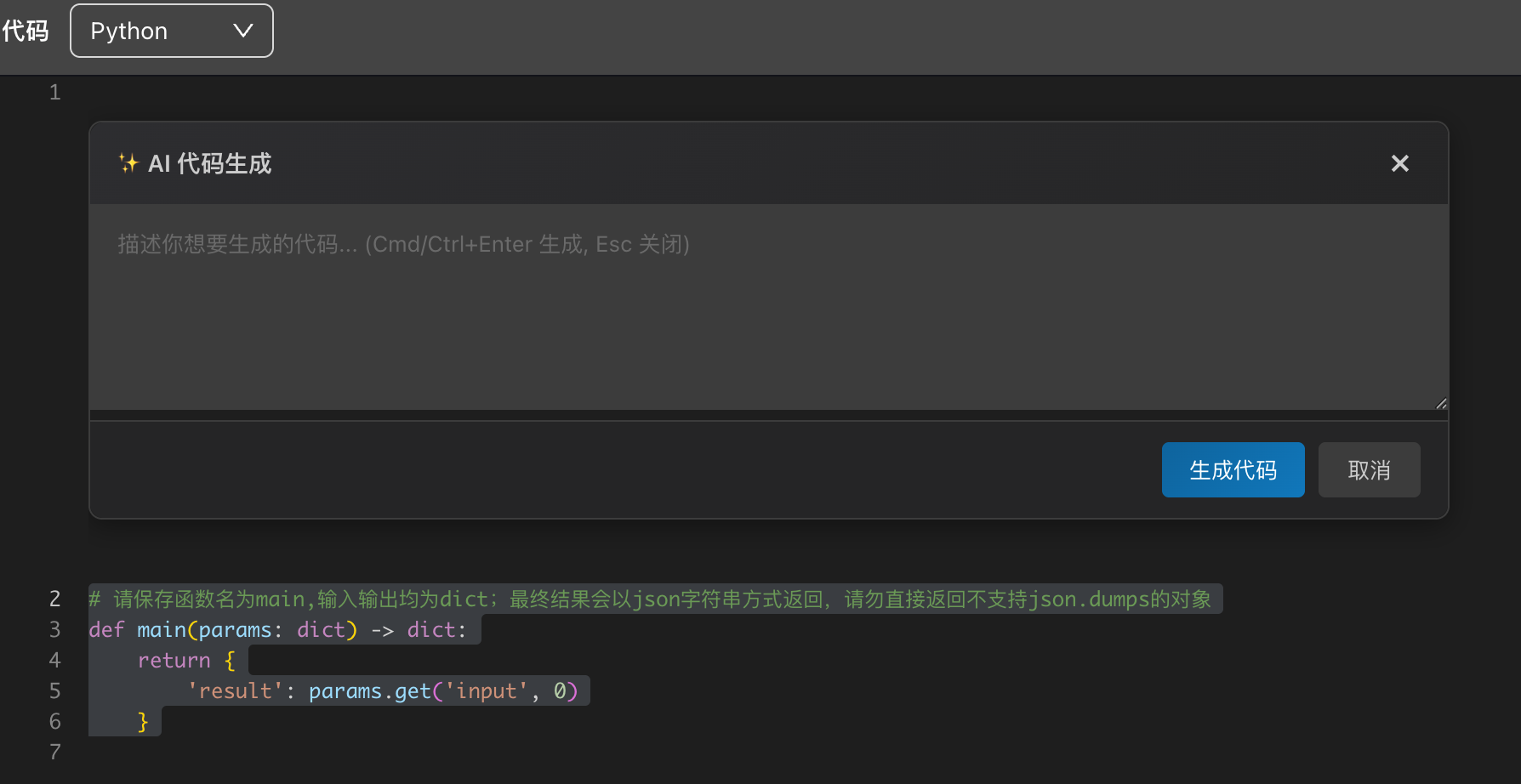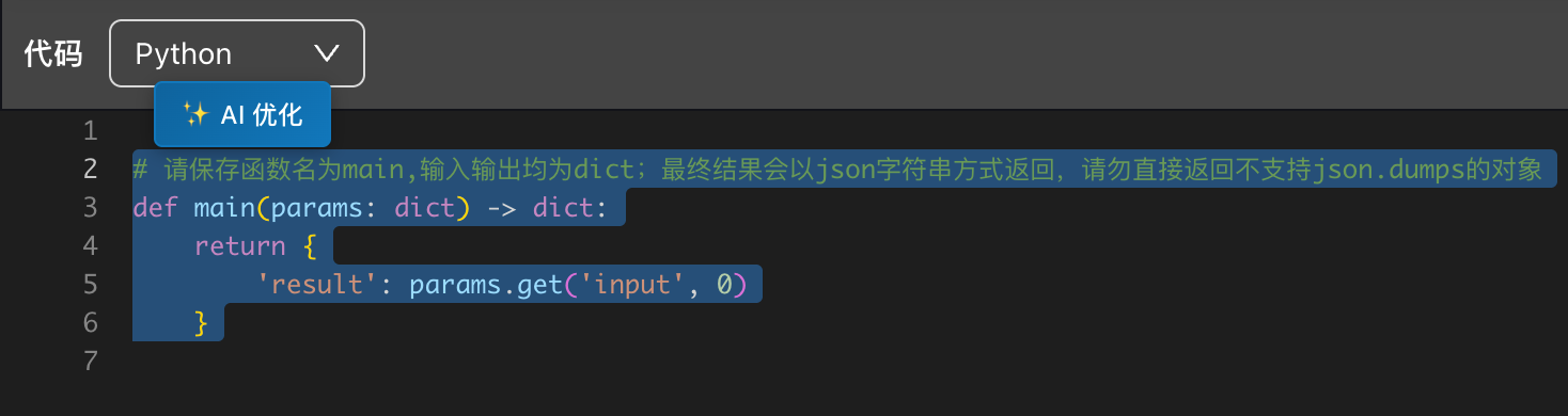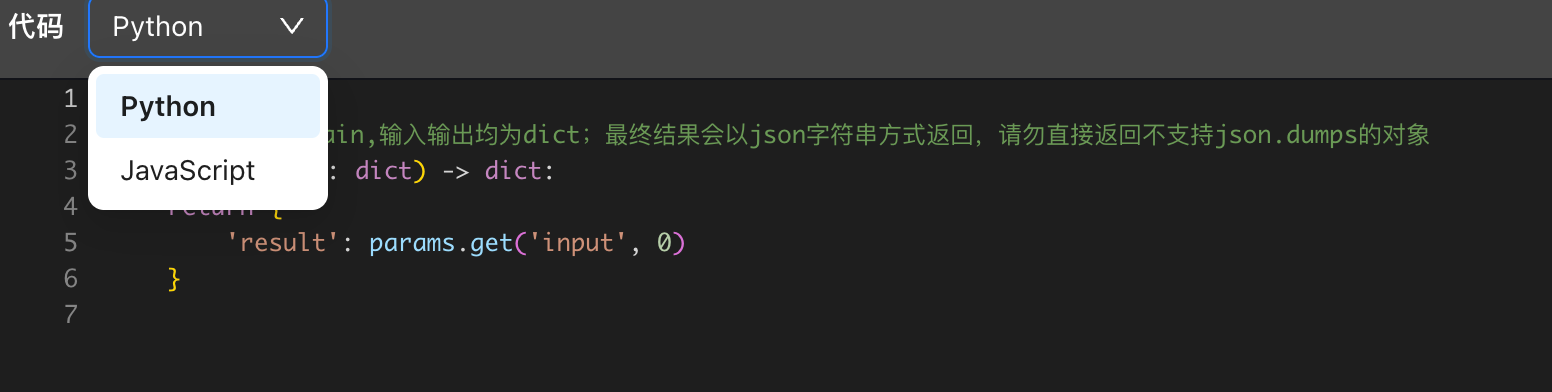 不管使用哪种编程语言,在编辑代码时,都需要定义函数名为 main。对于 Python 语言,在代码节点中,输入输出均为 dict,可通过 params.get('input') 调用输入变量;对于 JavaScript 语言,输入输出均为 object,可通过 params.input 调用输入变量。