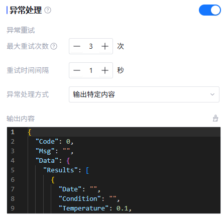 可手动开启异常处理,支持异常重试和异常情况的输出内容配置。配置内容如下: