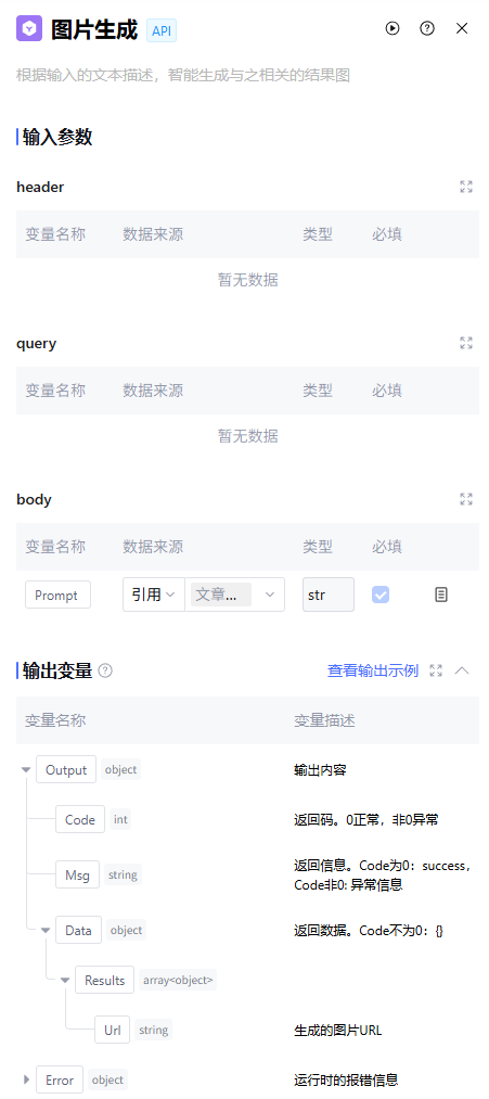经该节点处理后的输出变量,默认包含调用该工具所返回的结果,以及运行时报错信息 Error(数据类型为 object,正常运行时该字段为空)。不支持手动新增。
