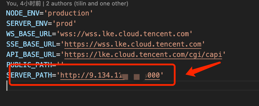 根据用户需求和用户域名灵活修改。// config/.env.prodNODE_ENV='production'SERVER_ENV='prod'WS_BASE_URL='wss://wss.lke.cloud.tencent.com'SSE_BASE_URL='https://wss.lke.cloud.tencent.com'API_BASE_URL='https://lke.cloud.tencent.com/cgi/capi'// 根据用户的域名做灵活修改PUBLIC_PATH=''// 根据部署服务的地址做灵活修改,本示例是在本地启动,所以配置如下SERVER_PATH='http://localhost:3000'