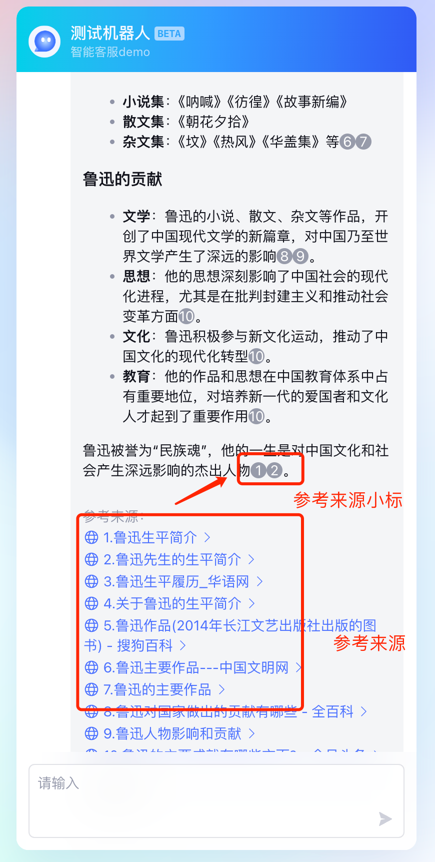 参考来源 demo 中支持搜索类型和文档类型的展示,暂不支持问答类型的内容展示,其中搜索类型的参考来源展示可以支持在回答中展示小标,回溯定位到参考来源内容,如下图所示: