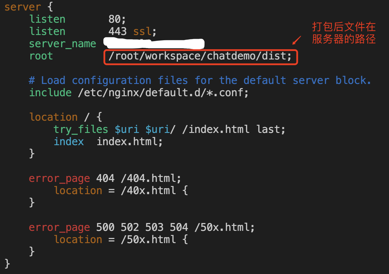 5. 将打包后的 dist 文件夹拷贝到服务器中,并将文件夹路径在 nginx 配置文件中设置为 root(也可以基于其他 root 对 location / 做相应的配置),重启 nginx 即可,可参考下图例子: