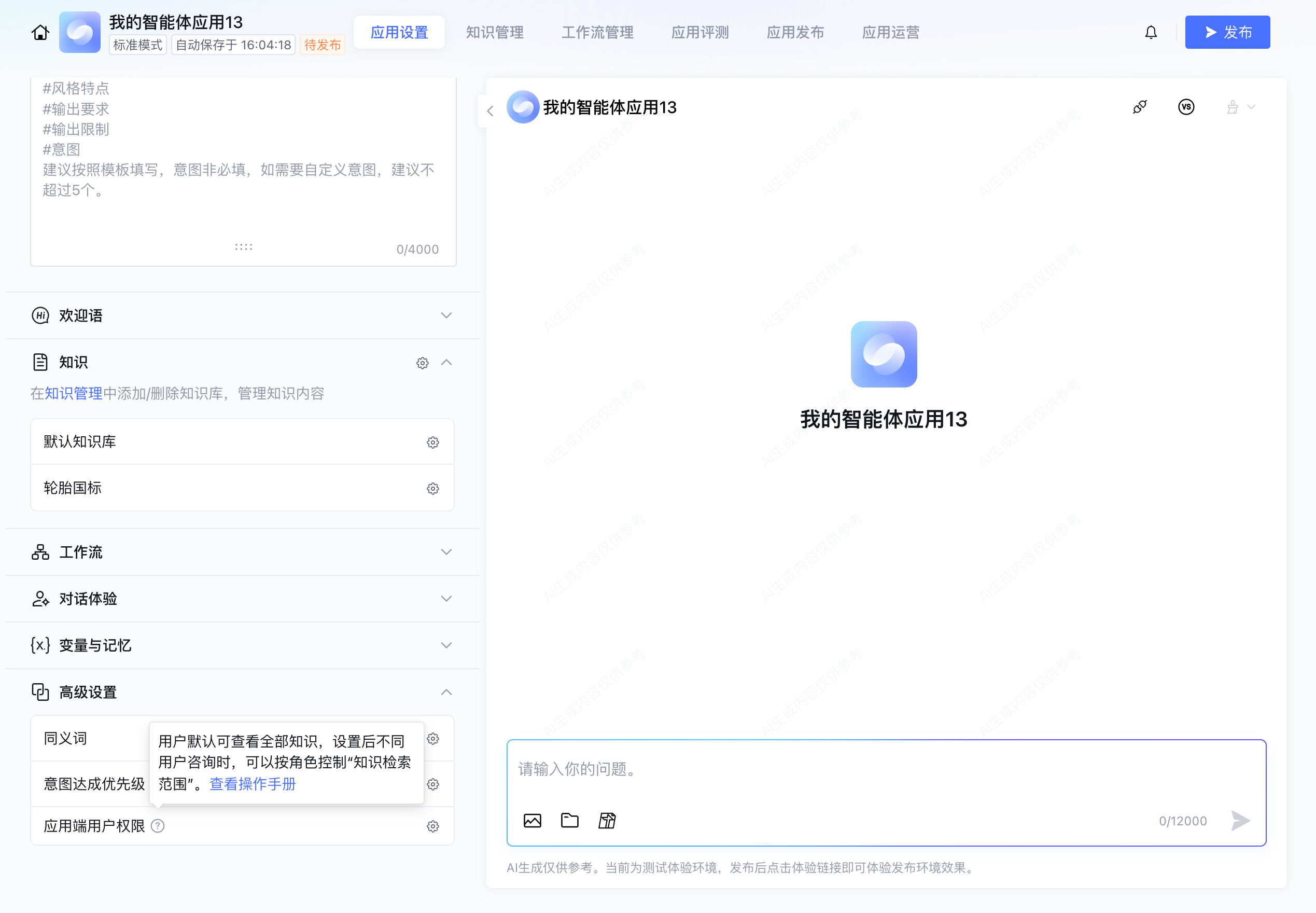 在知识库中添加知识后,默认所有应用端用户可以访问该应用下的全部知识范围。应用端用户权限配置在应用维度生效:每个应用单独配置,不互相影响。