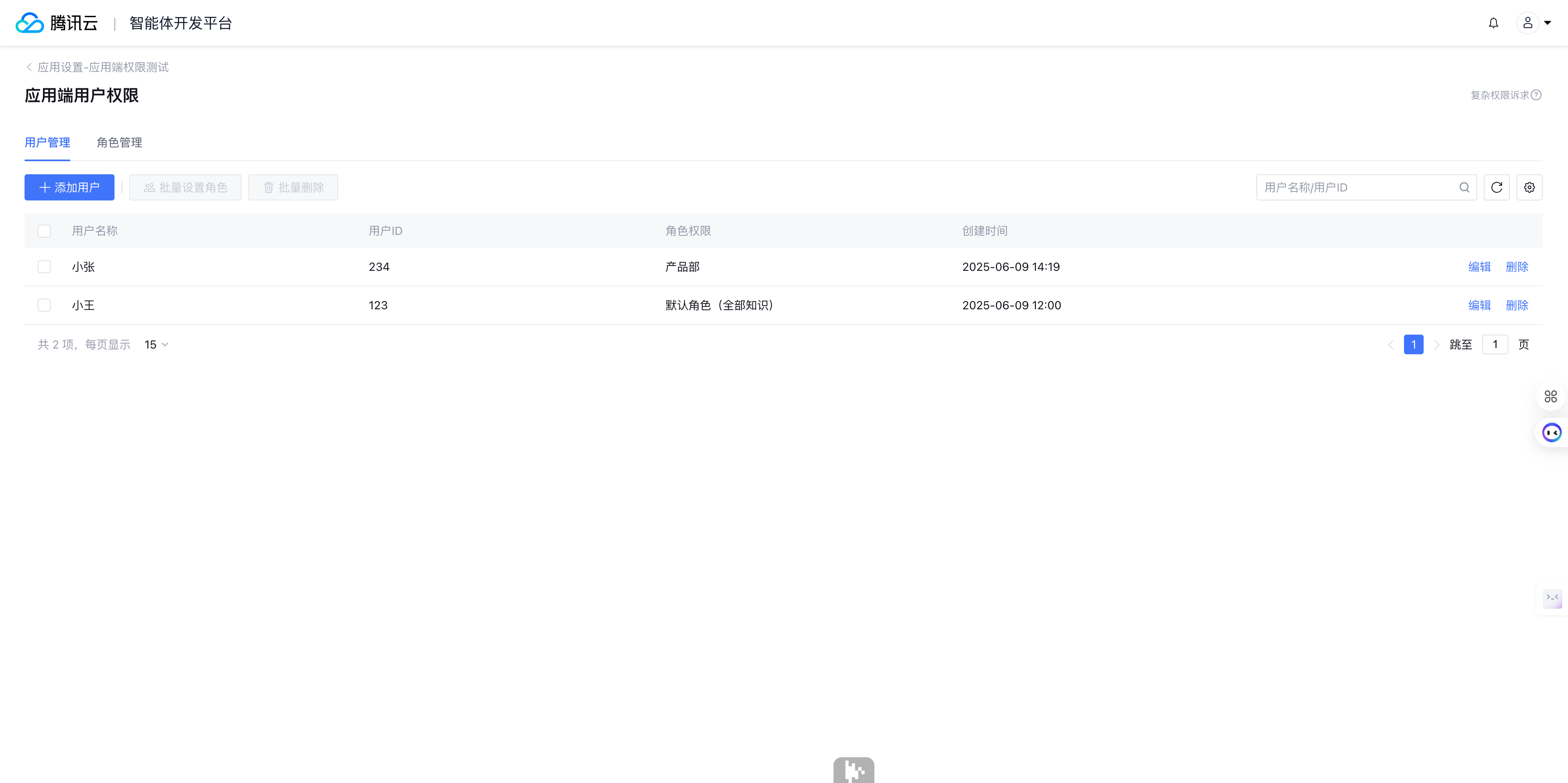 在用户管理中添加用户 ID 和用户名称,为用户选择角色。应用端该用户咨询时,按角色权限的知识范围回复该用户。