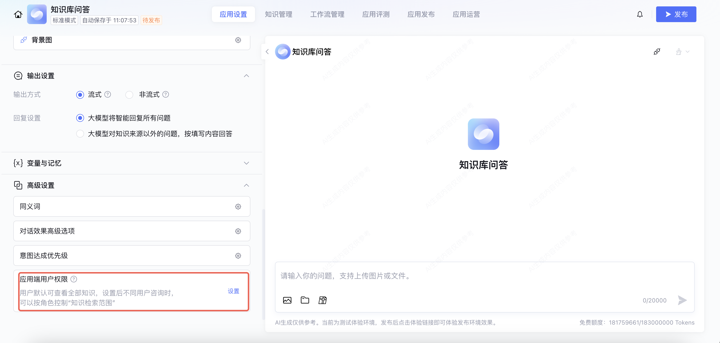 应用端用户权限:支持设置应用端用户的“知识权限”,实现应用端用户仅可咨询对应权限范围的知识。