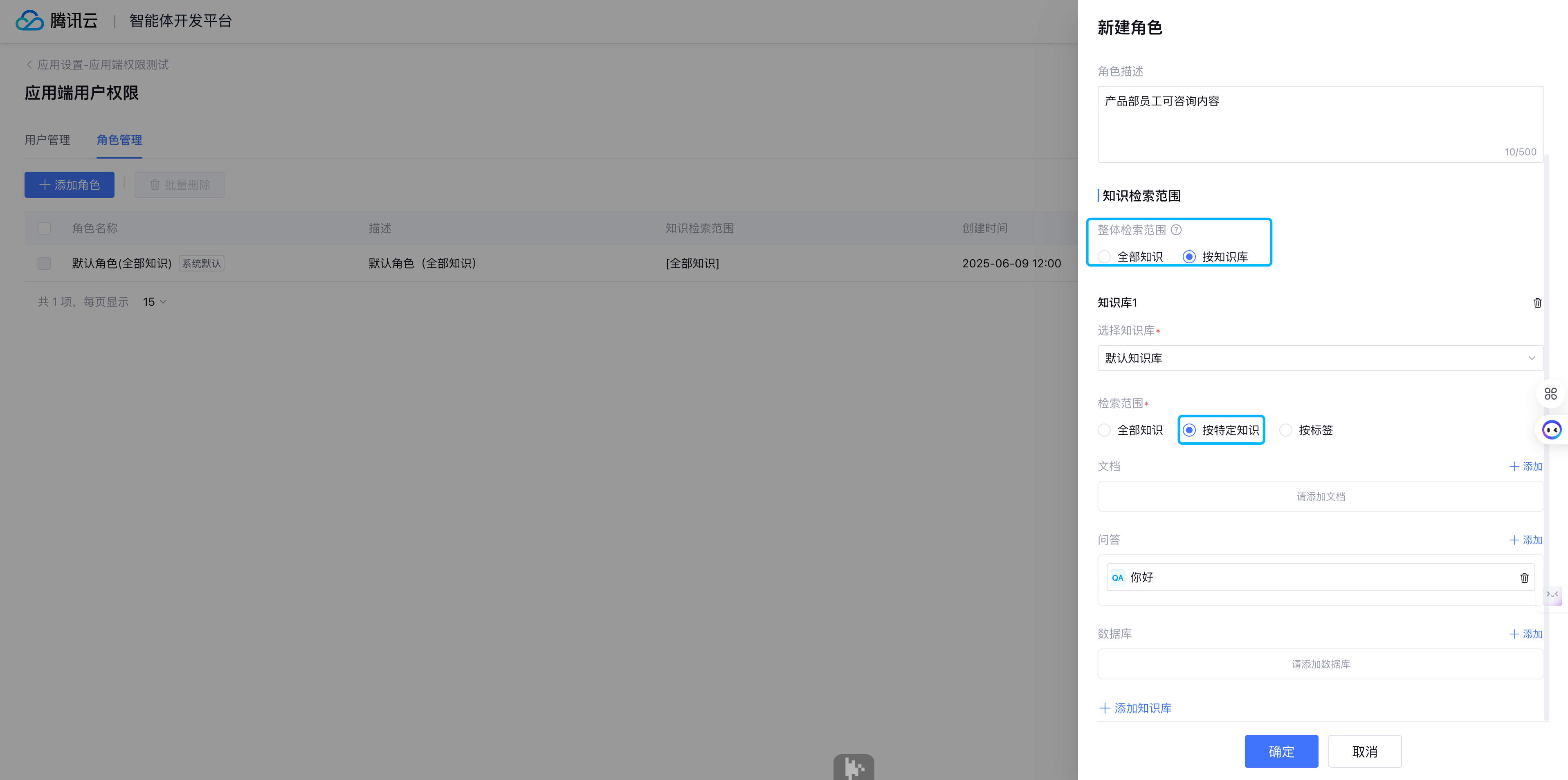 角色管理中提供的默认角色支持查看全部知识范围。可选择知识检索范围创建其他角色,如产品部角色。
