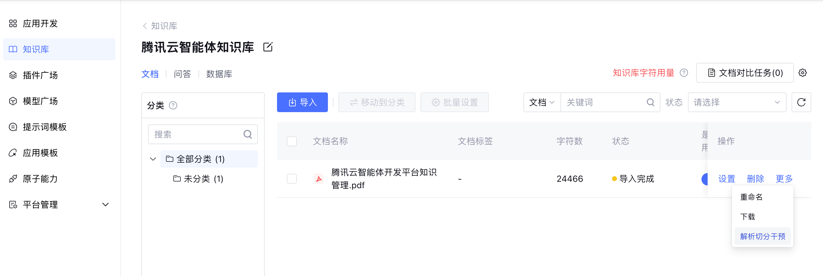 进入知识库,单击某个文档右侧更多菜单内的解析切分干预。