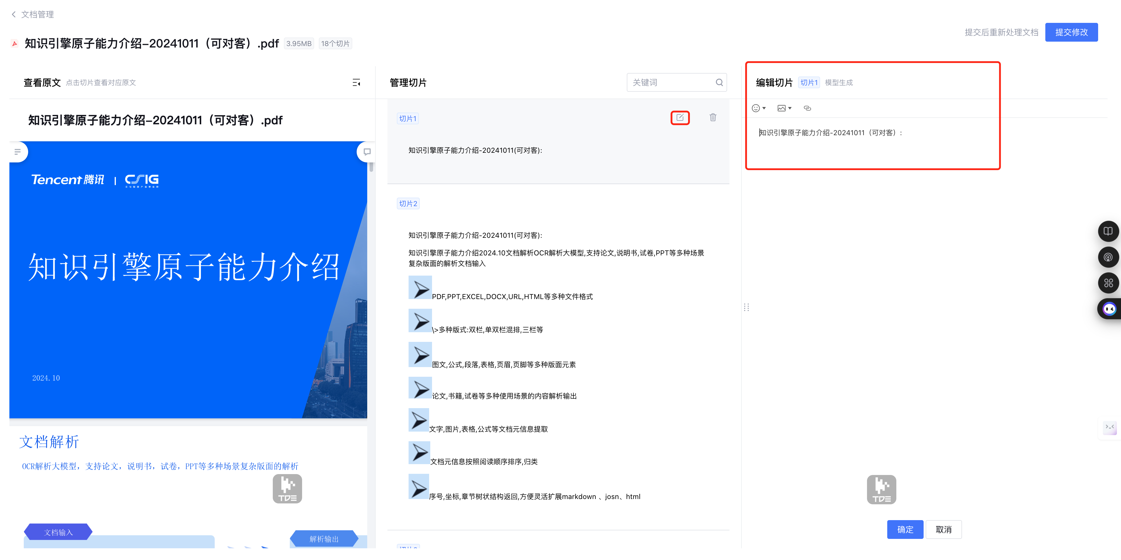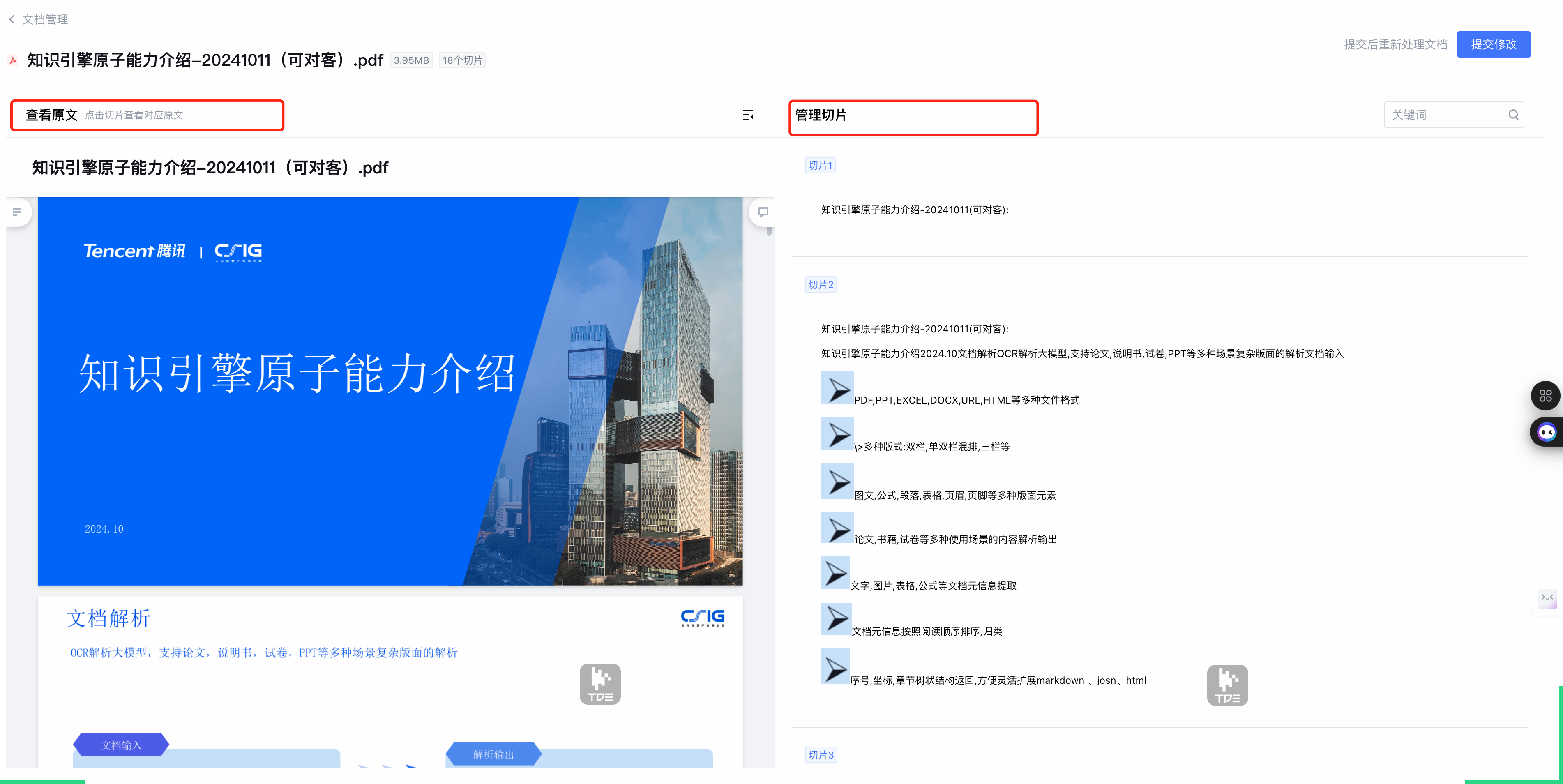 进入管理切片页面。可以在页面左侧查看原文,右边支持查看切片,点击切片区域定位原文页码。