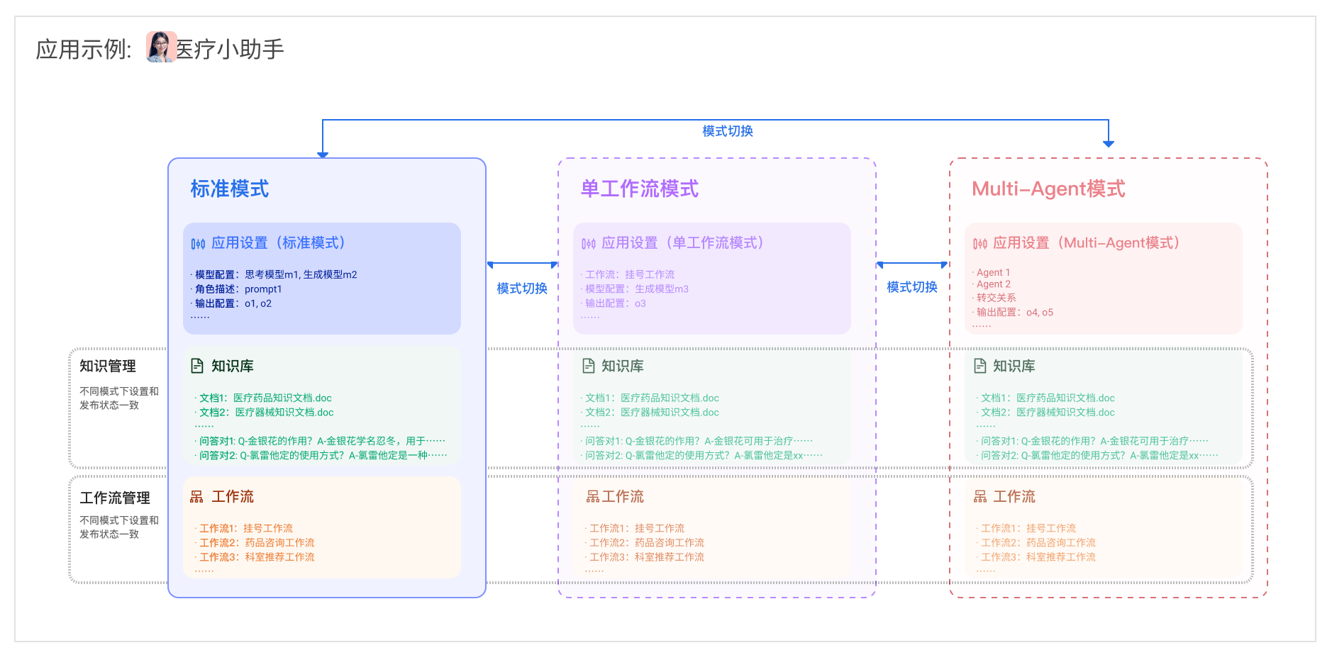 知识管理 | 模式切换后,知识库设置和发布状态保持不变。 | 模式切换后,知识库设置和发布状态保持不变。 仅支持在工作流中的知识相关节点使用,包括大模型知识问答、知识检索节点。 | 模式切换后,知识库设置和发布状态保持不变。 Multi-Agent 模式需要选择“知识库问答”插件启用知识库内容问答。 |
