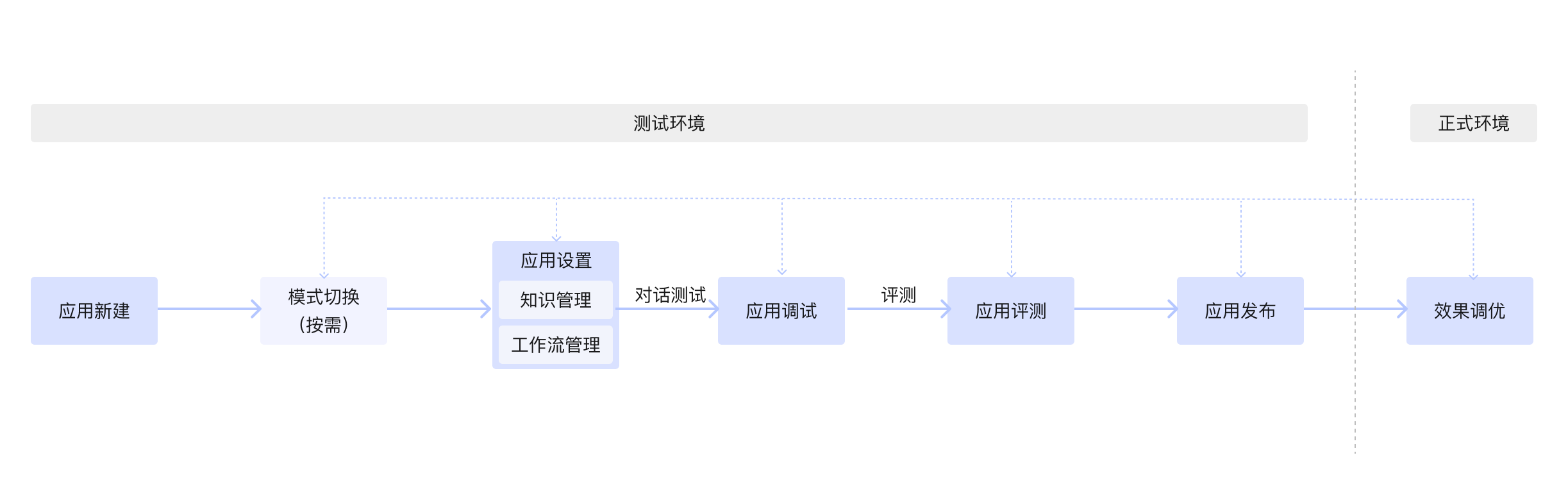 应用新建后,您可调整应用设置项、上传知识、搭建工作流,在测试环境对话调试和评测效果达标后,可以发布应用到正式环境,发布后可以根据反馈进行效果调优,再次更新调试配置。应用搭建的完整流程如下图所示: