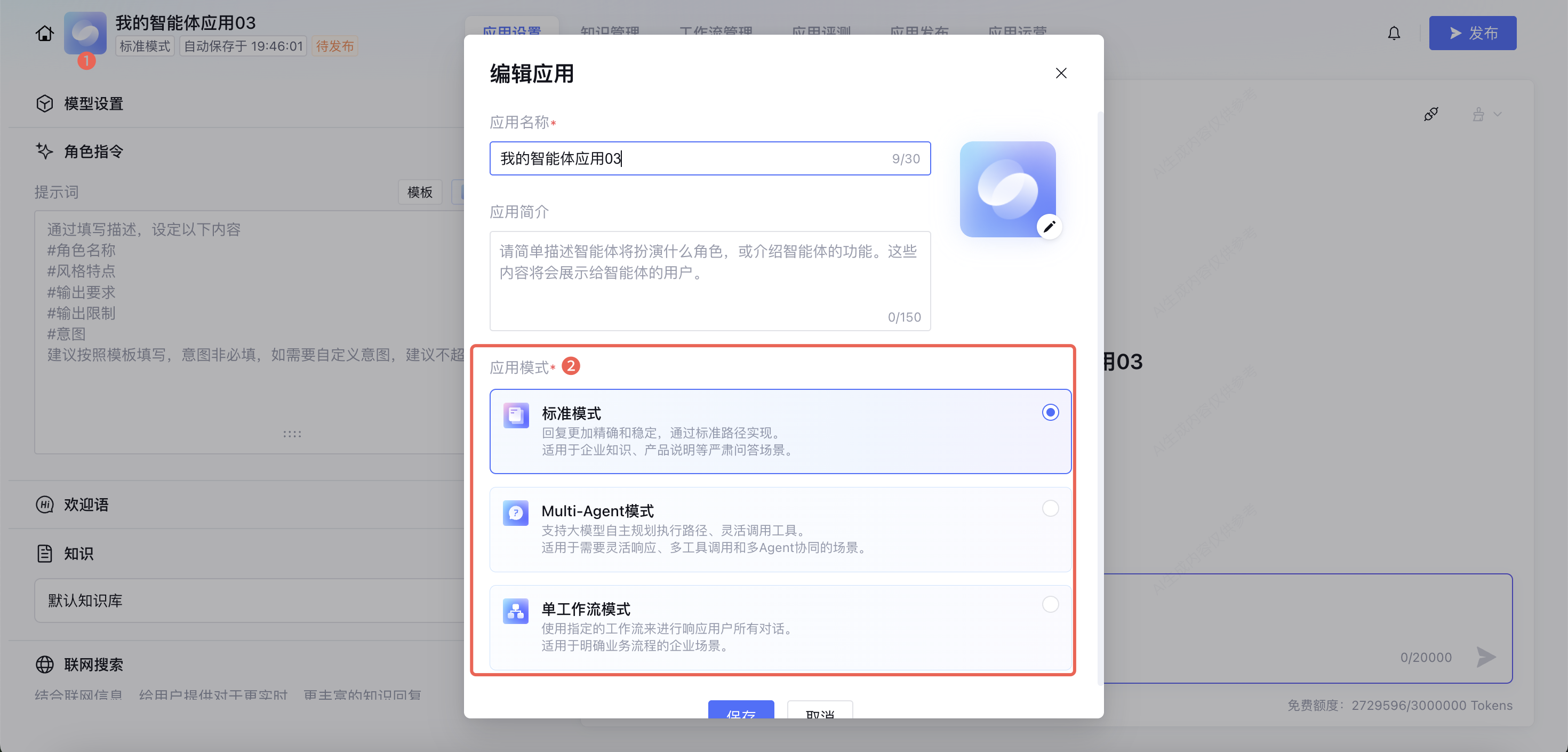 在实际搭建中,支持根据应用落地场景的需要进行应用模式切换:点击头像或者模式 tag,即可在编辑应用中进行应用模式的切换。
