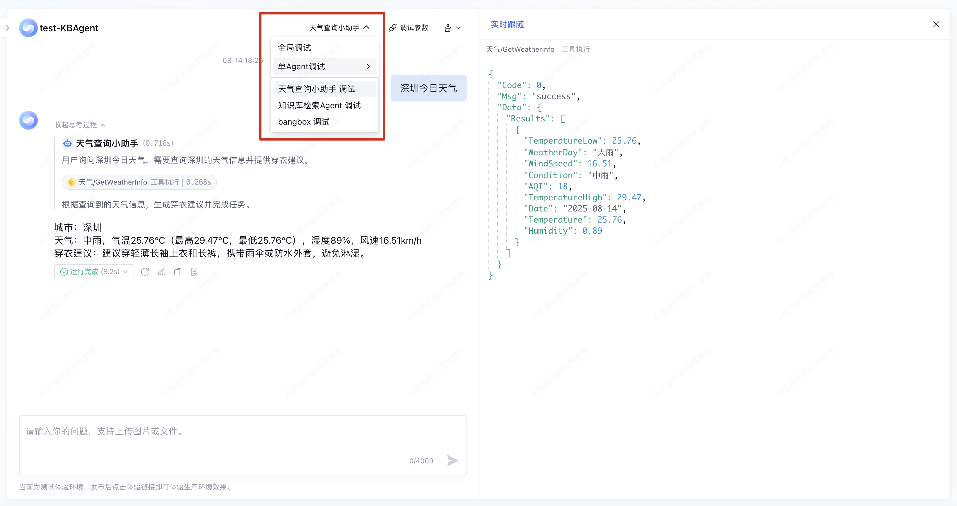 在应用设置对话界面切换至全局调试模式,即可测试 Multi-Agent 应用效果。