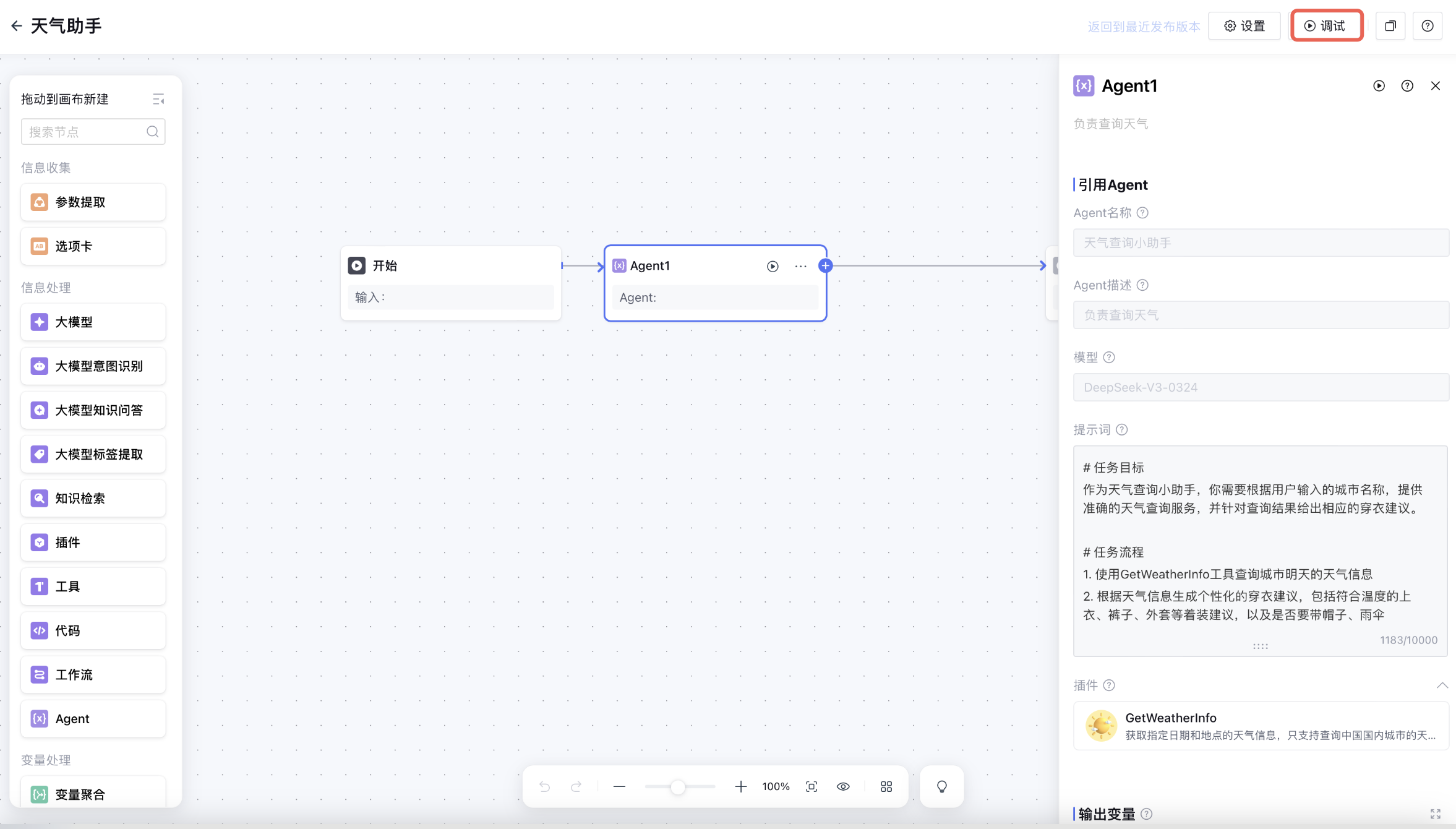 完成工作流配置后,点击右上角调试验证工作流效果。