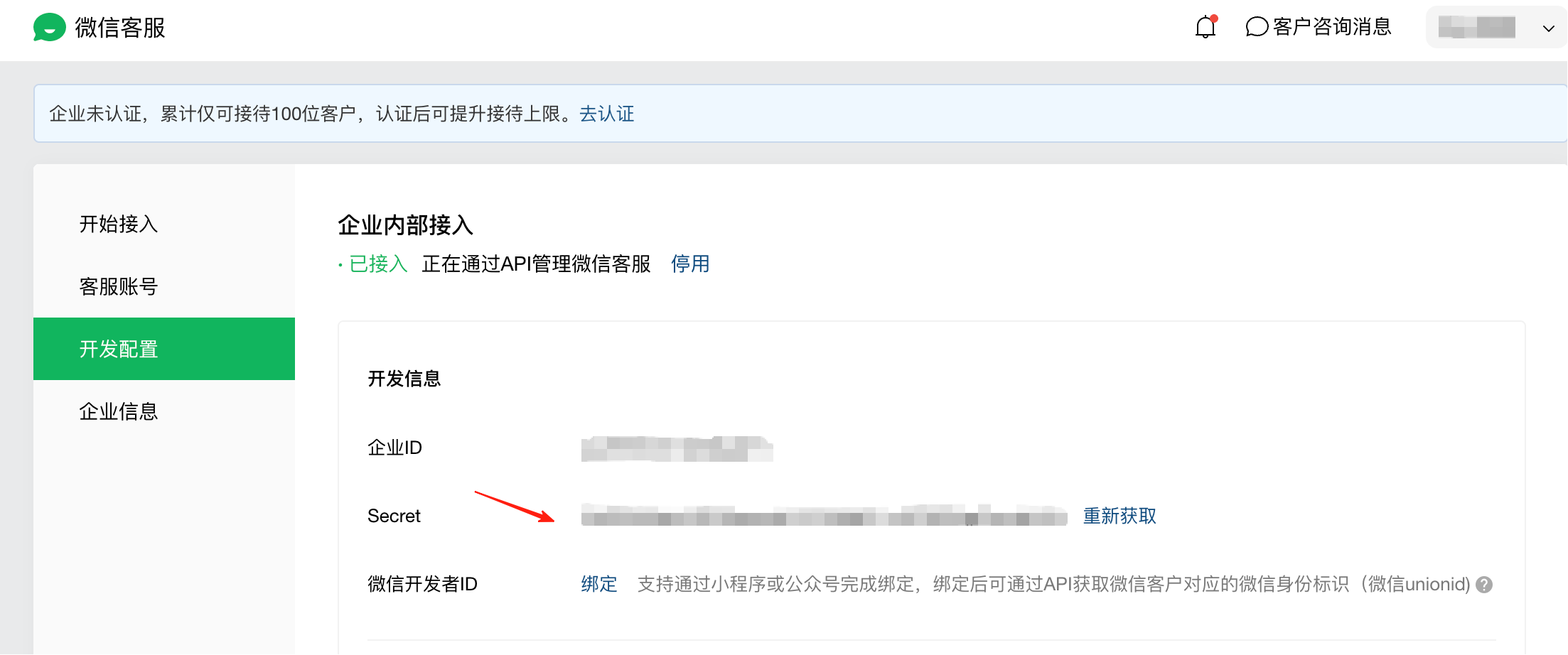 3. 单击下一步,从 微信客服后台 > 企业信息 > 获取企业 secret。