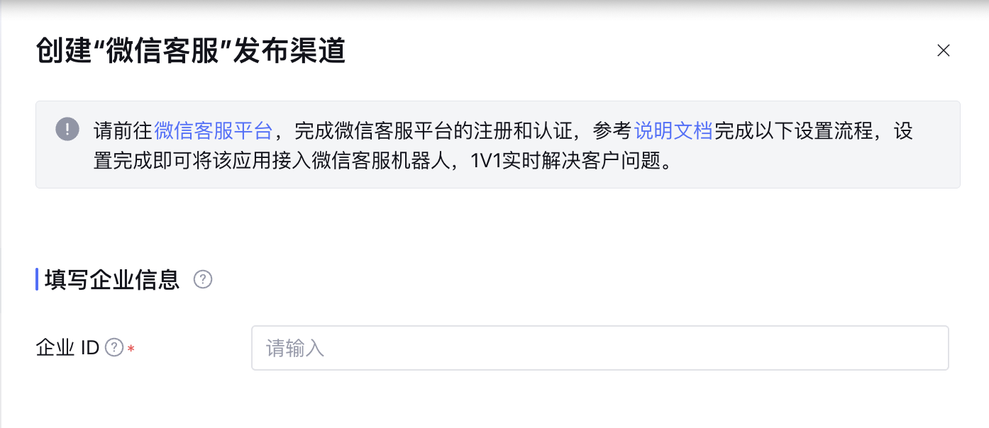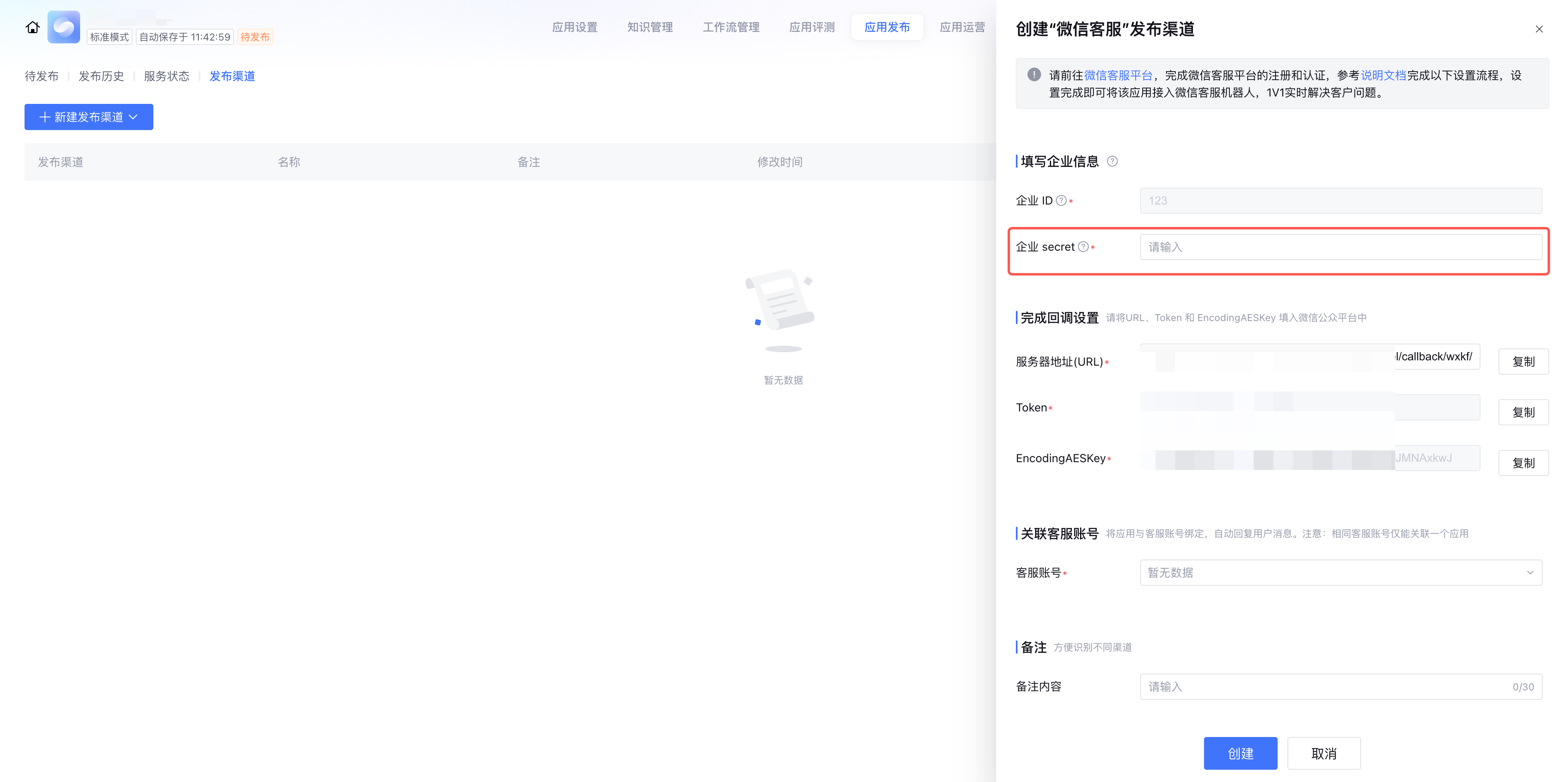5. 发布应用时选择微信客服渠道。成功发布后,您可以前往微信客服与智能体对话。