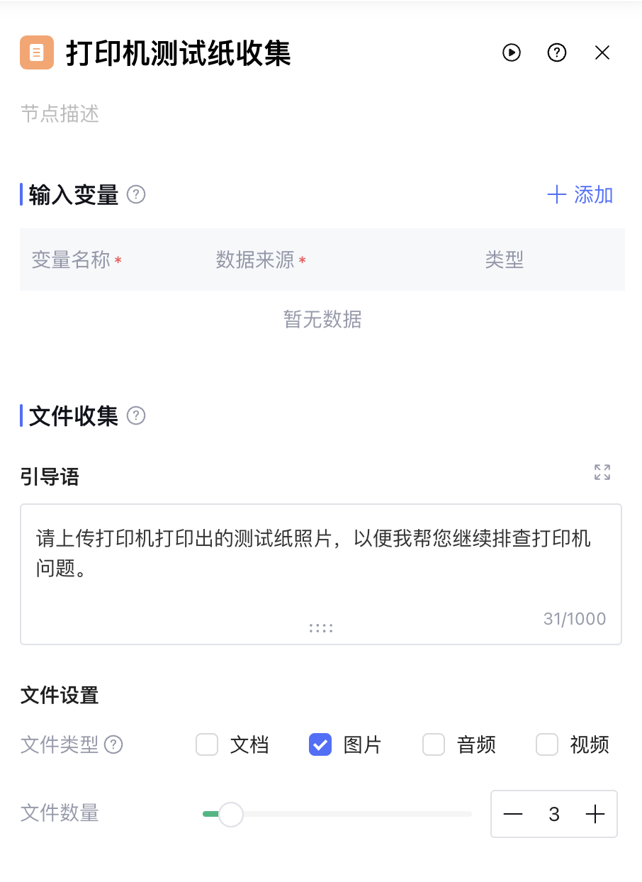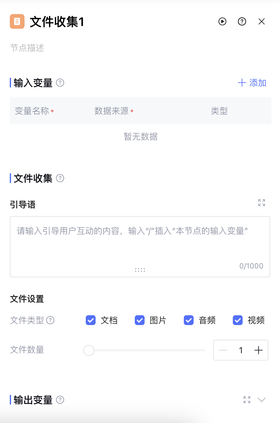 支持配置文件收集时的引导语,用于询问或提示用户上传什么类型的文件。提示词输入框支持通过输入“/”引用该节点的输入变量。