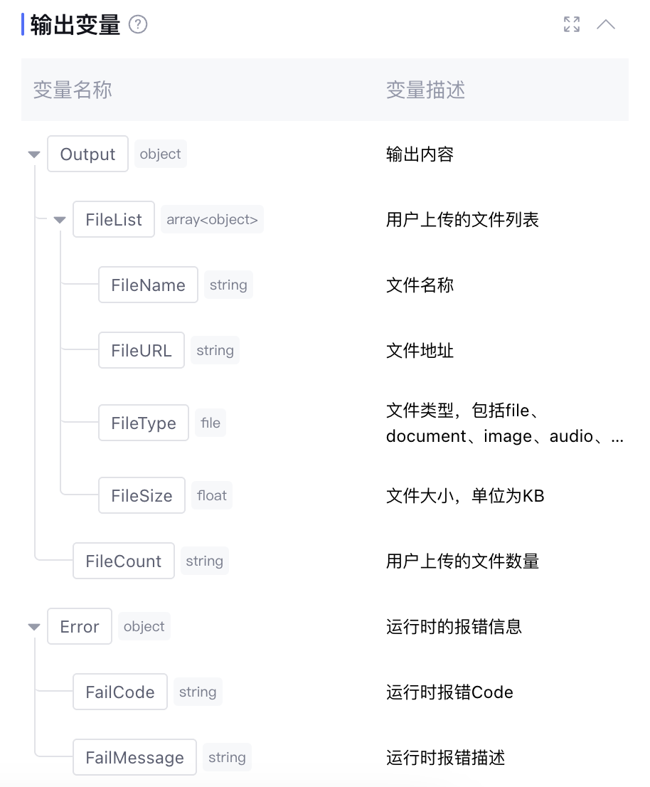 文件收集节点属于信息收集类节点,用于在工作流中的特定环节收集文件,当工作流运行到“文件收集节点”时,系统会向用户发出文件收集的询问,此时用户上传的文件会自动进入到工作流并由特定字段承接,后序处理流程可以使用该字段获取用户的文件。