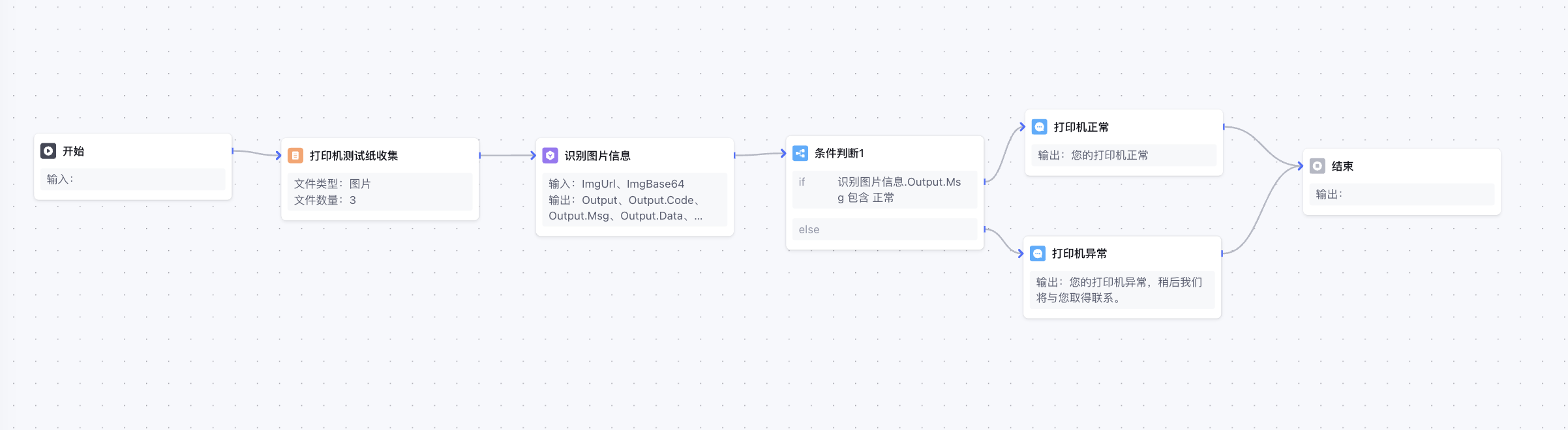 在打印机问题排查场景中,通过设置文件收集节点,收集打印机测试纸的照片,然后通过图片识别插件识别打印纸内容,从而判断打印机是否正常。