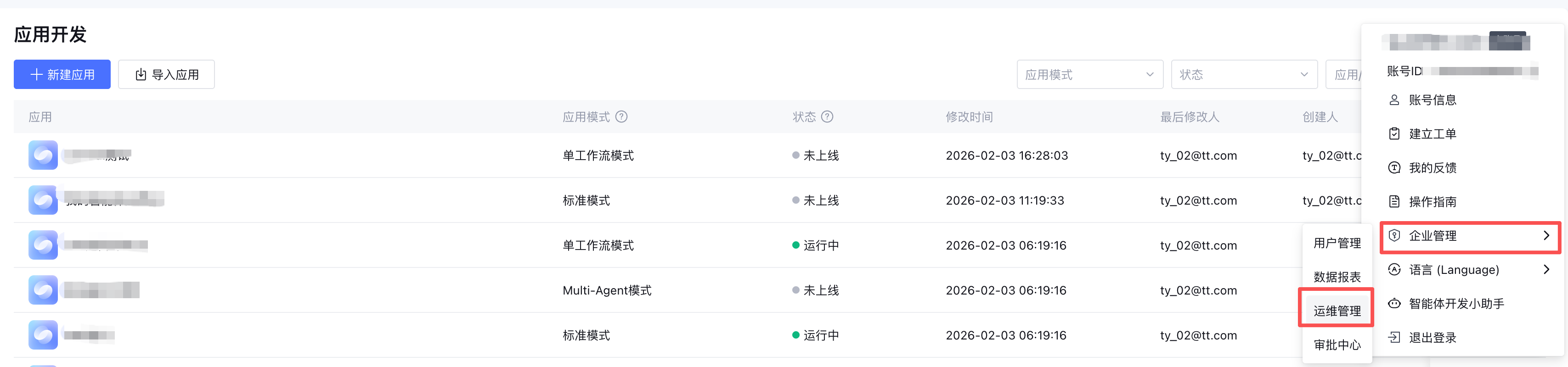 仅空间管理员支持访问企业管理 > 运维管理模块。