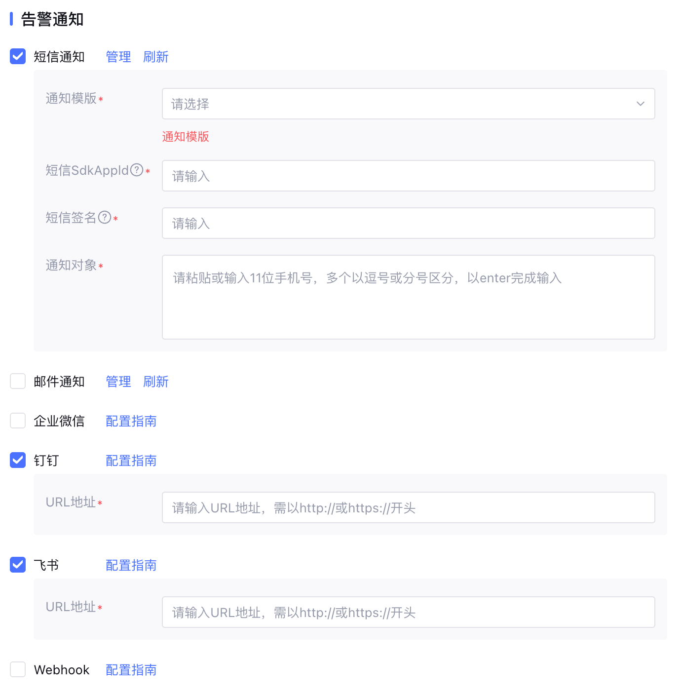 告警通知是平台在监测到指标达到告警策略预设阈值时,通过短信、邮件等指定渠道,向运维人员推送的异常提醒信息,实现异常的及时触达。目前支持短信、邮件、企业微信、钉钉、飞书、Webhook 等告警通知方式。
