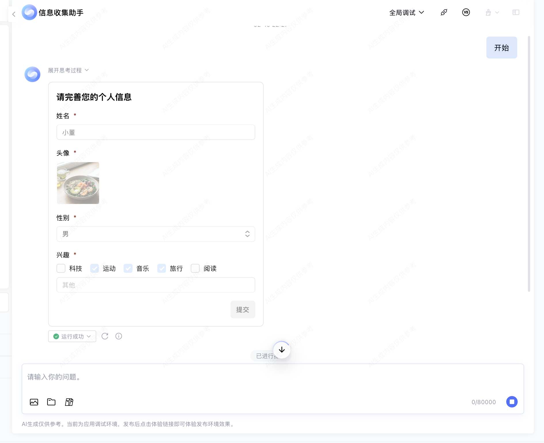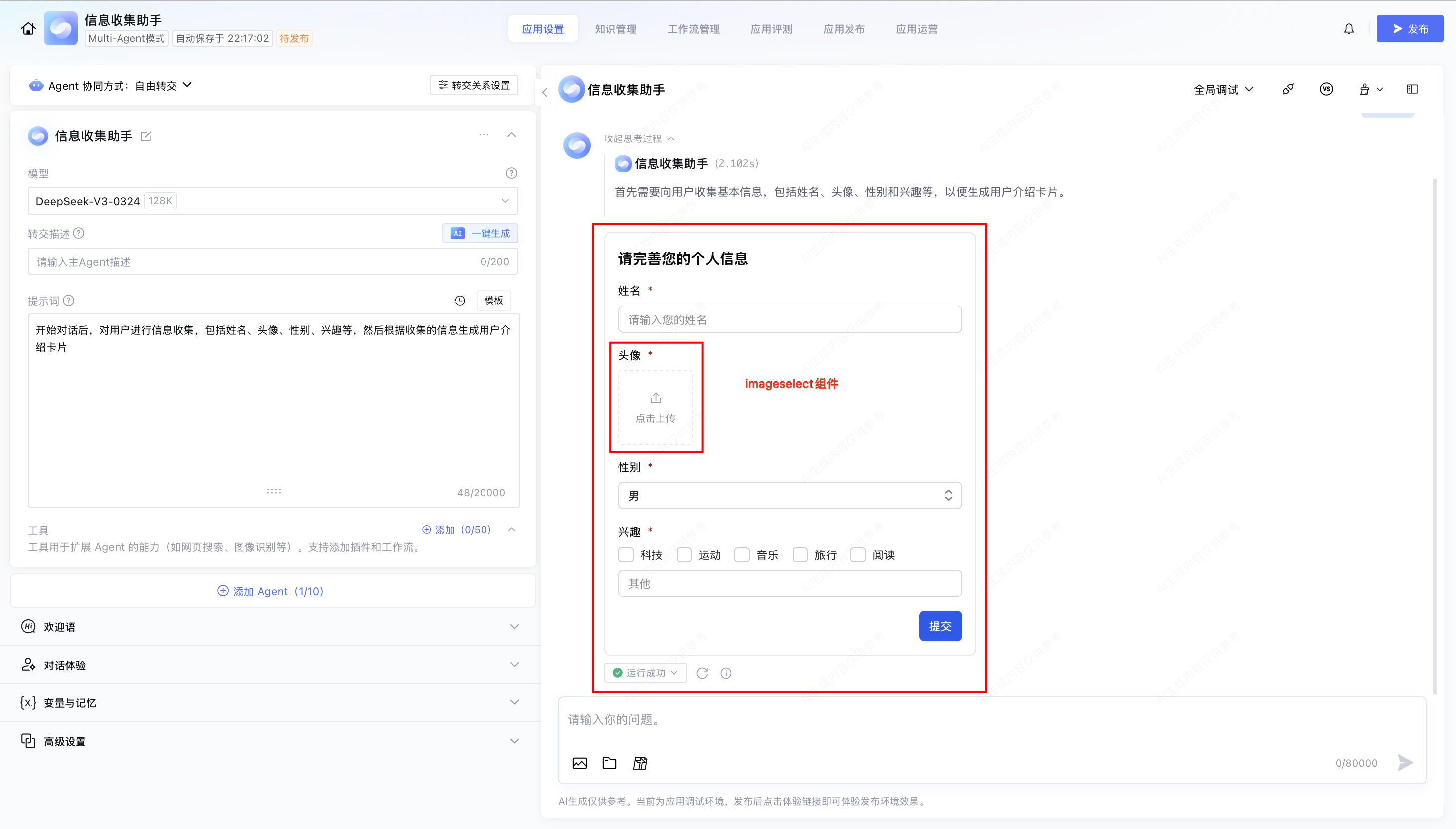 在 Multi-Agent 模式下,复合表单澄清询问 Widget 包含 ImageSelect 组件。以下以“应用信息收集助手”为例进行说明: