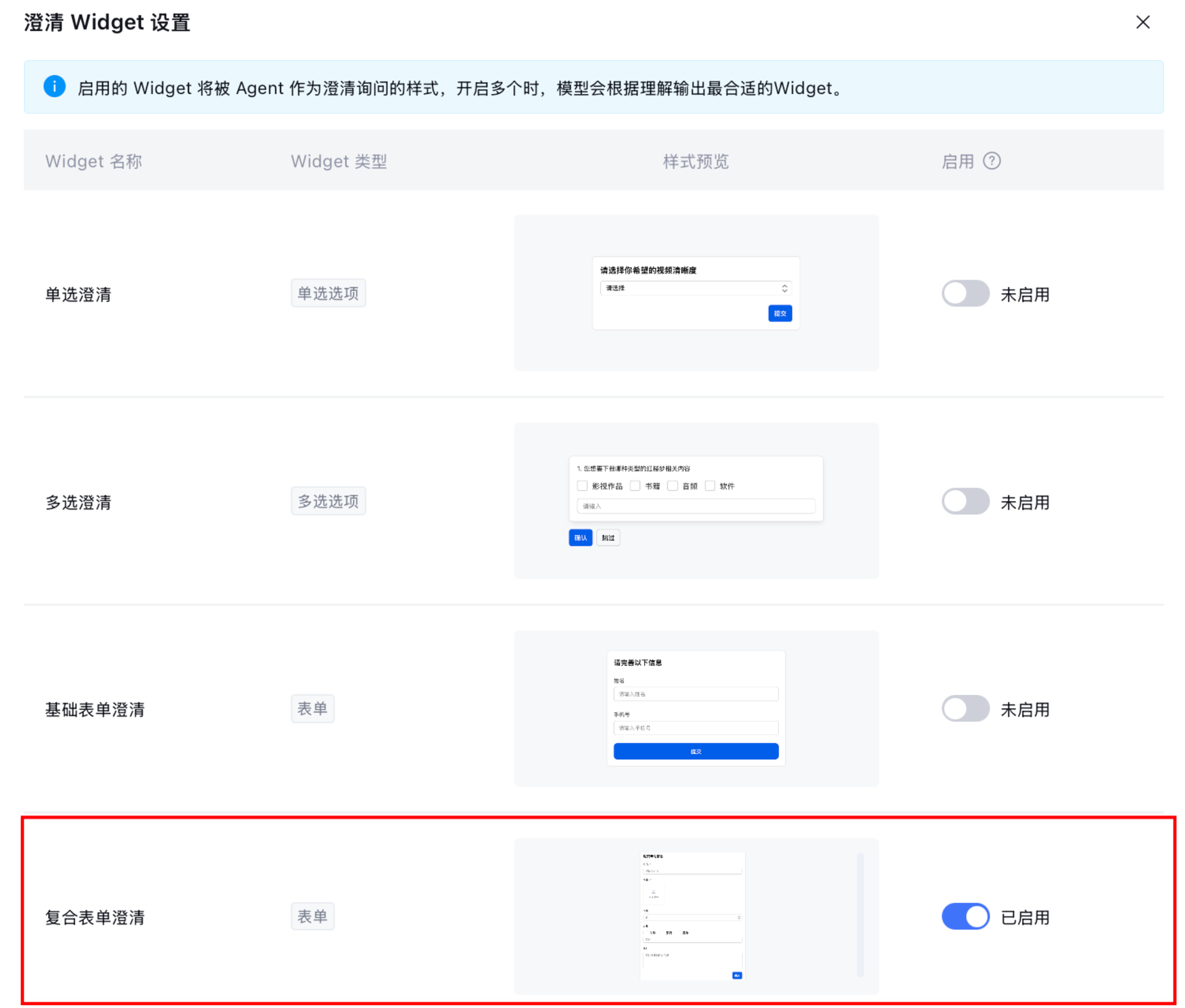 1. 进入 Agent 高级设置,在澄清样式中选择复合表单澄清。