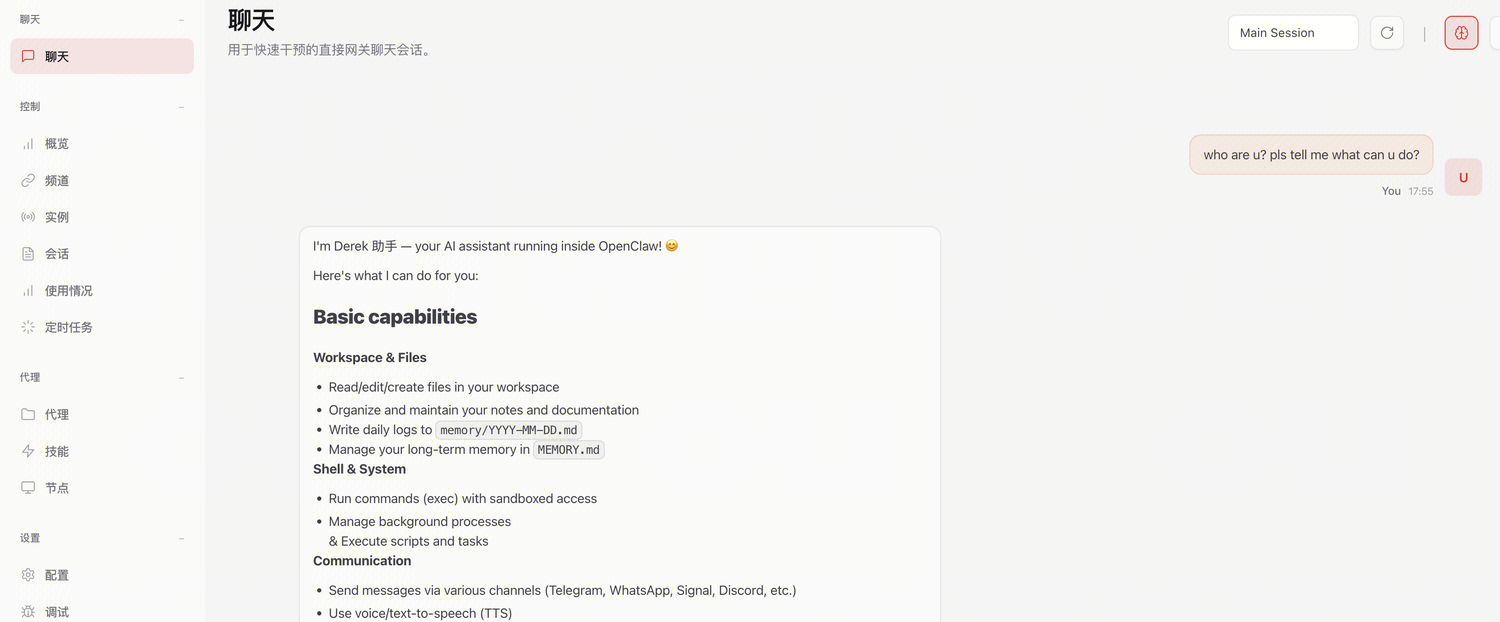通过命令 openclaw dashboard 打开 WebUI,点击 Web UI 的左侧聊天,即可进行交互。